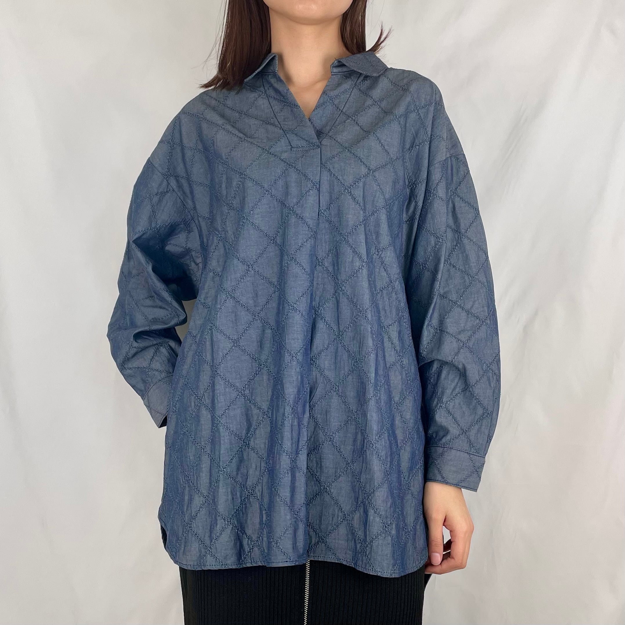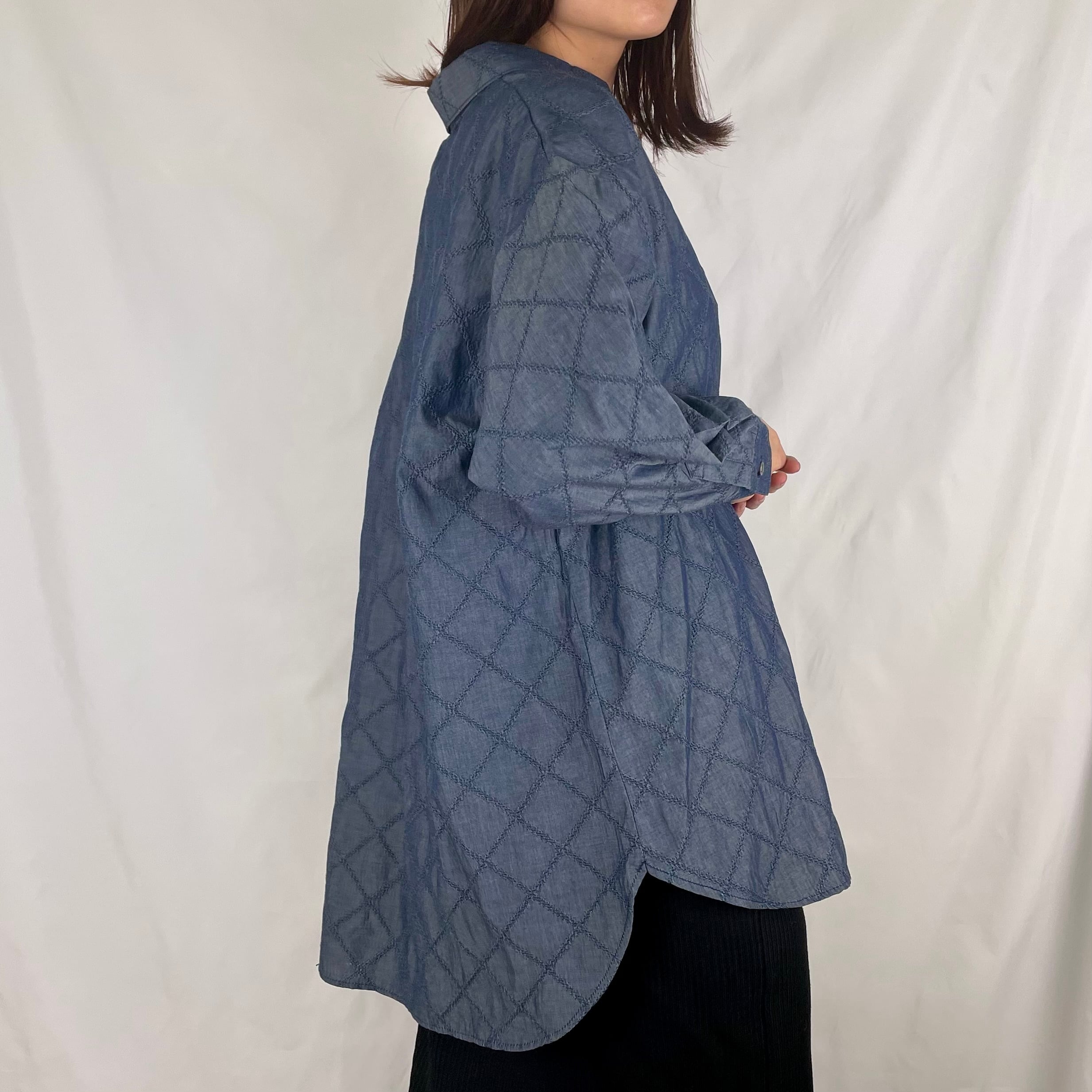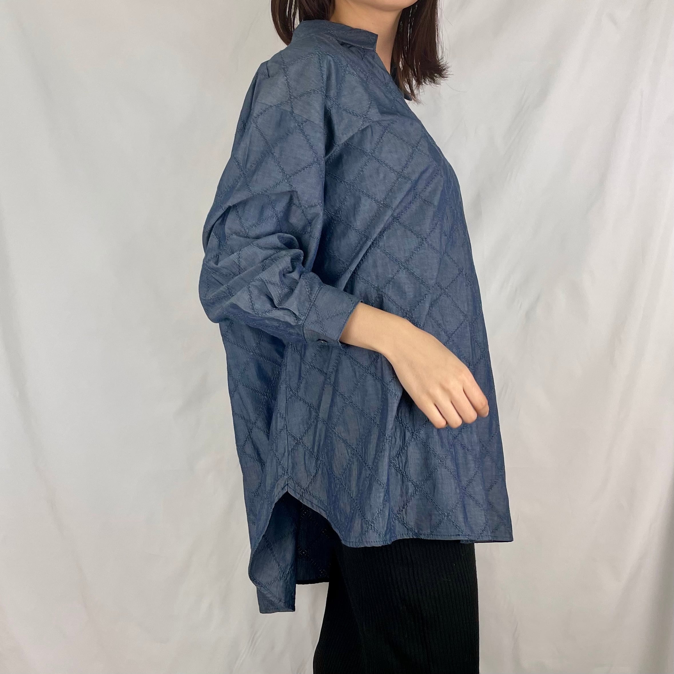 薄手のデニム生地にダイヤ柄の刺繍を施した、軽やかでデザイン性のある一枚。