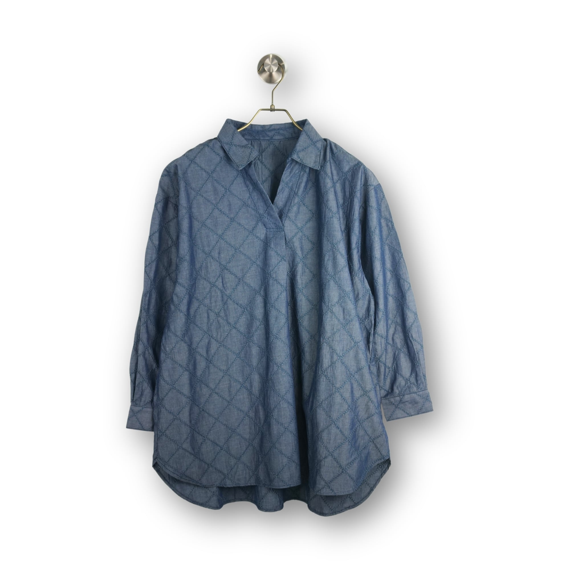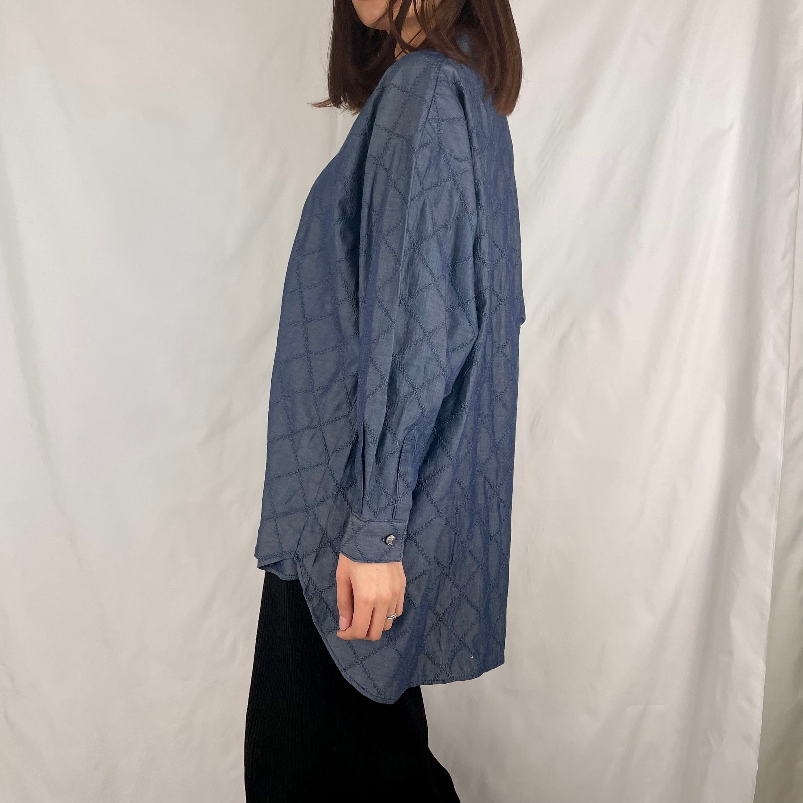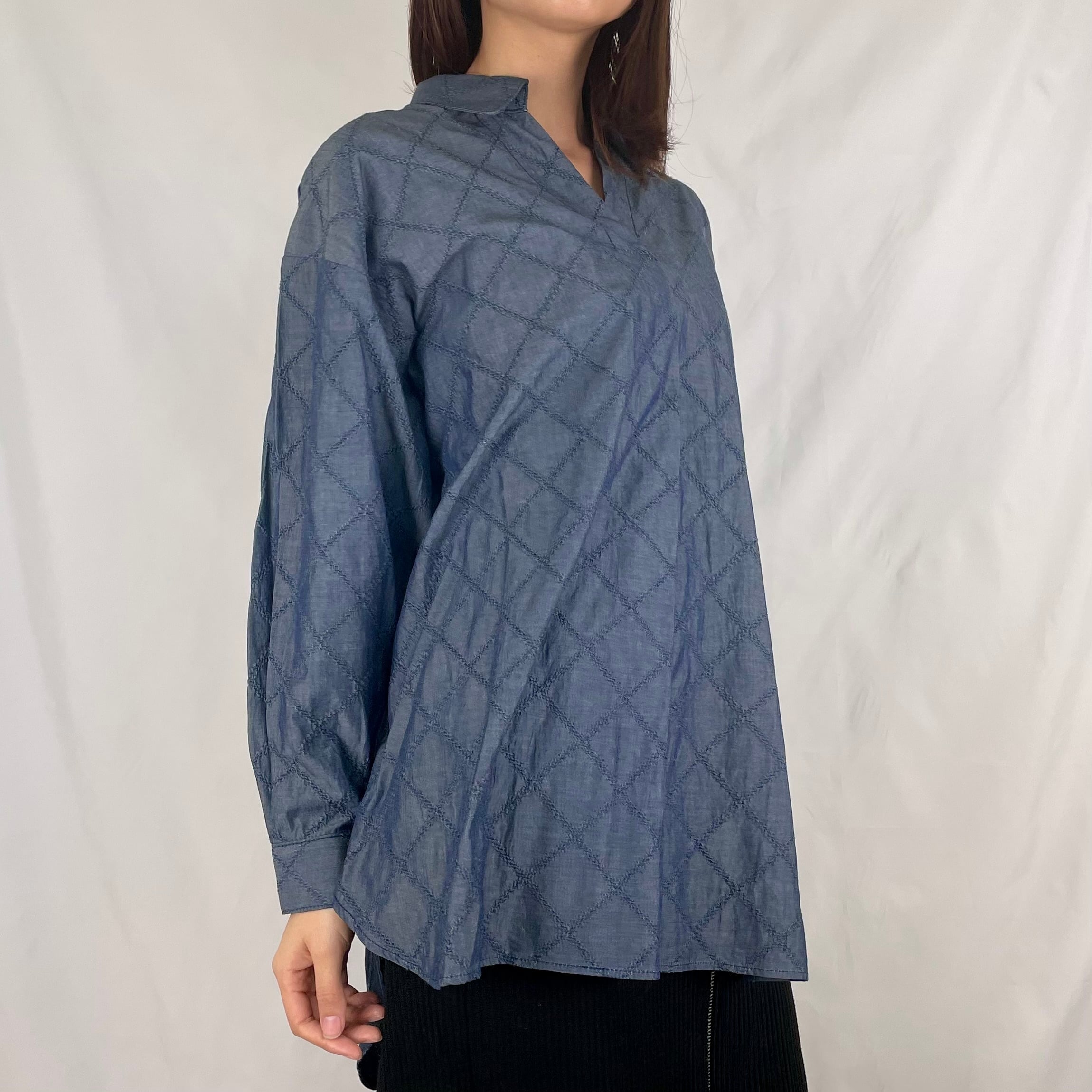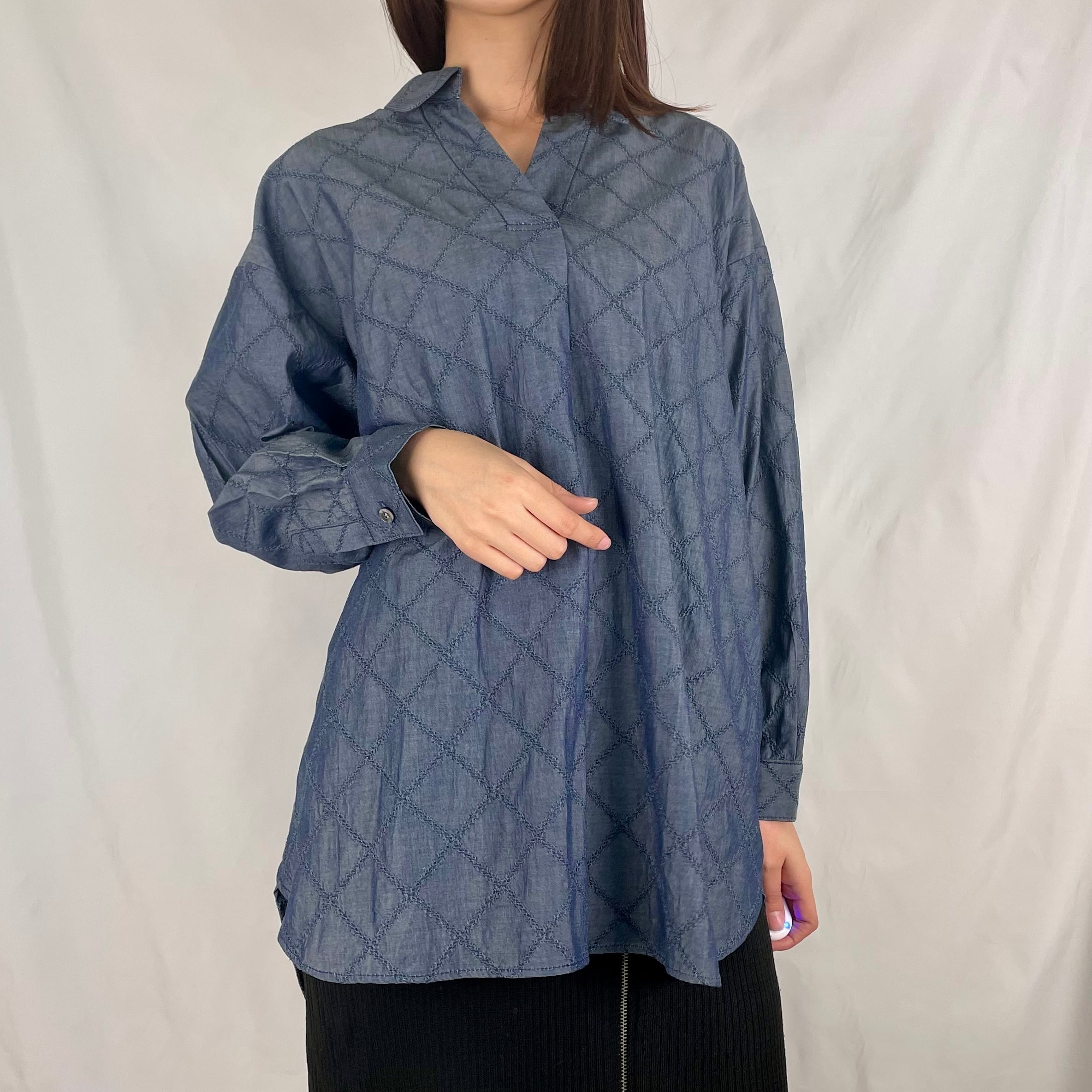 薄手のデニム生地にダイヤ柄の刺繍を施した、軽やかでデザイン性のある一枚。