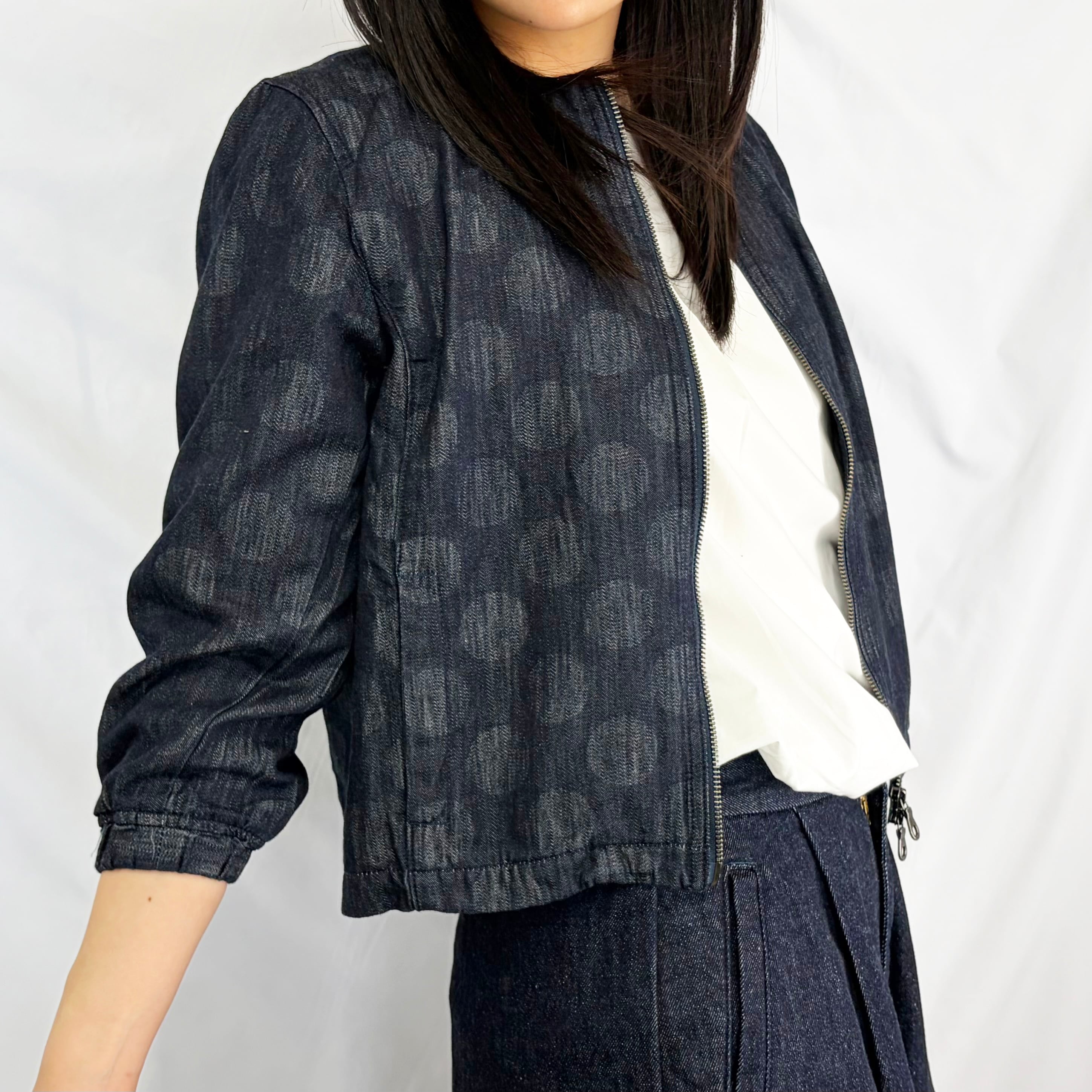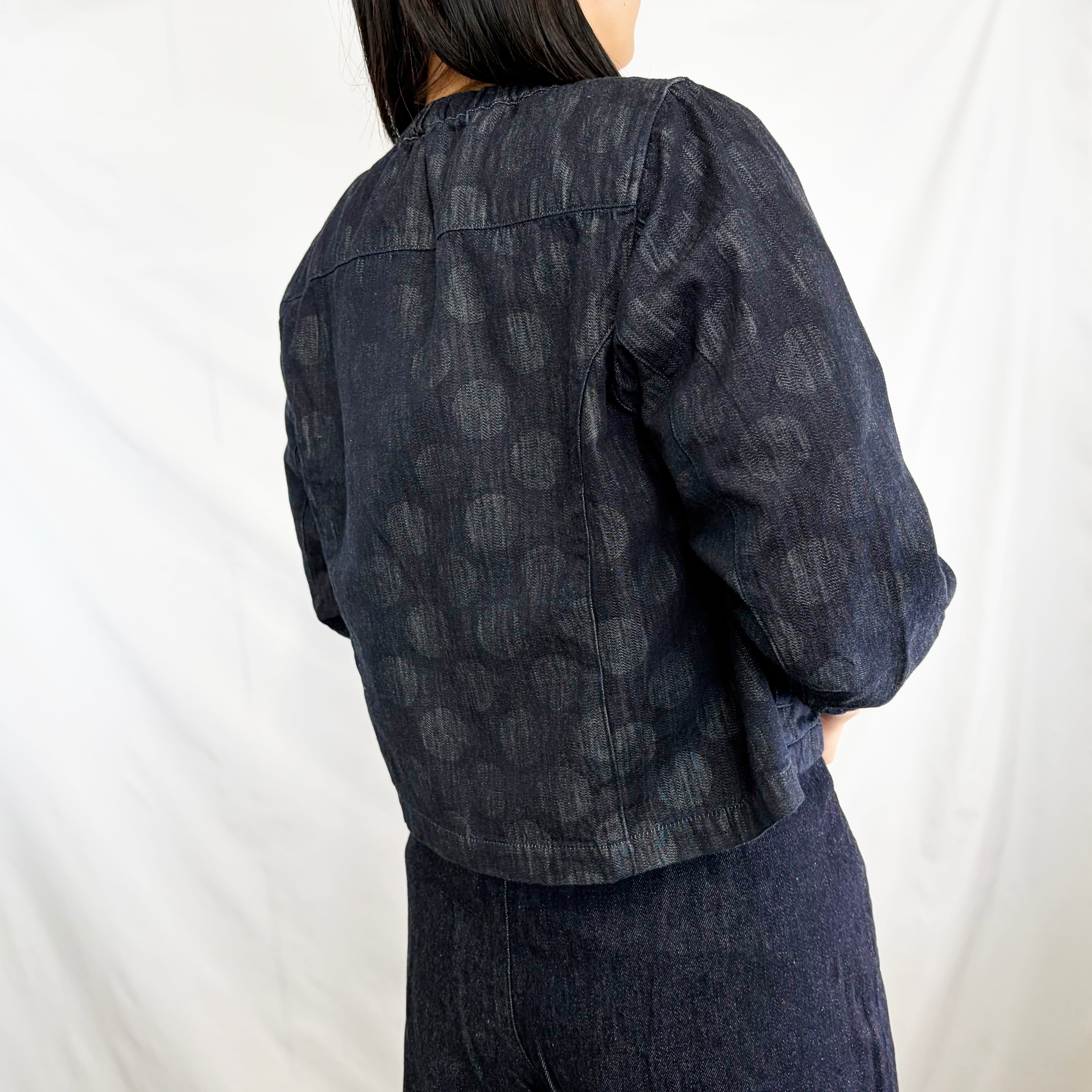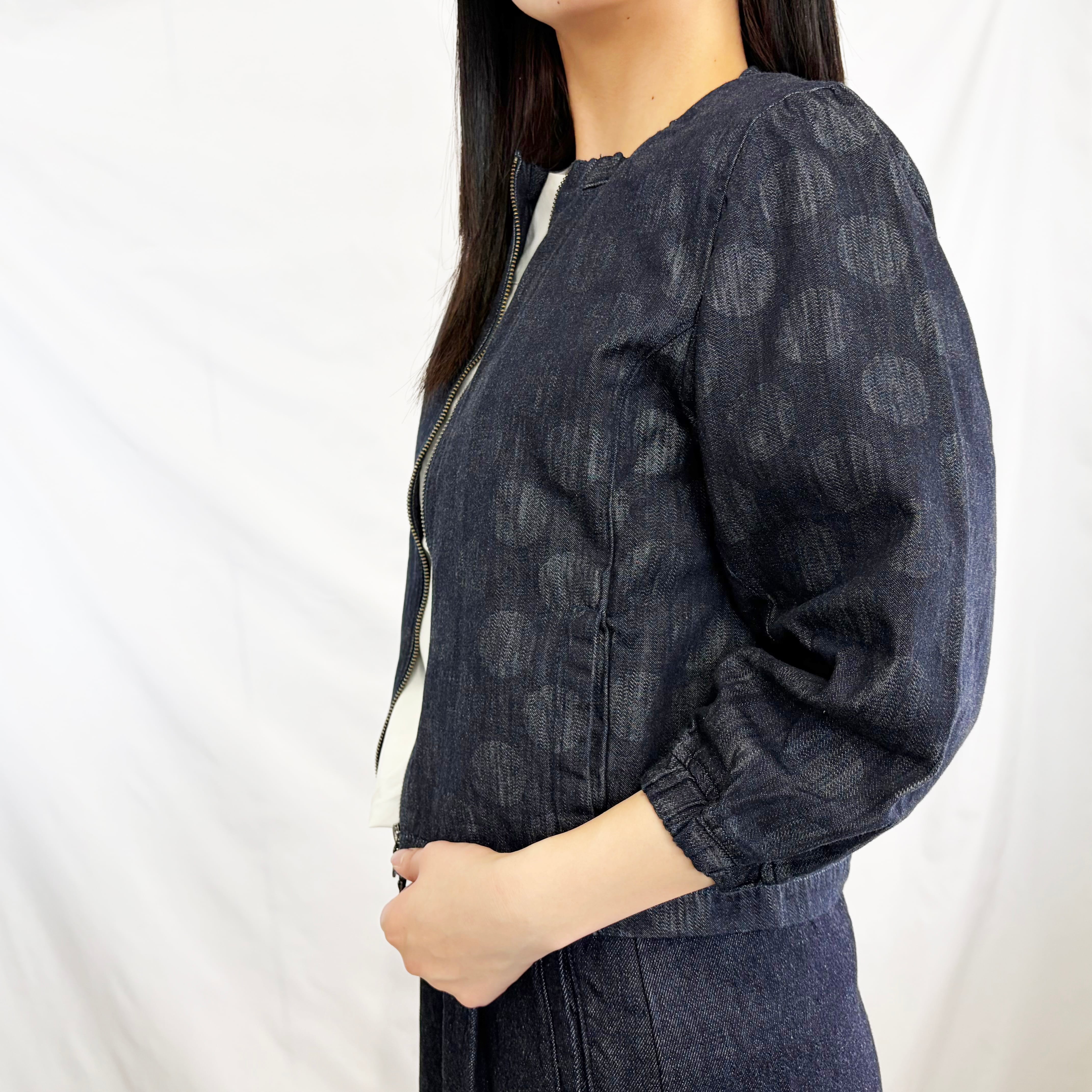 デニム調の落ち着いた色合いに、さりげない柄が浮かび上がり、シンプルながらも奥行きのある一着です。