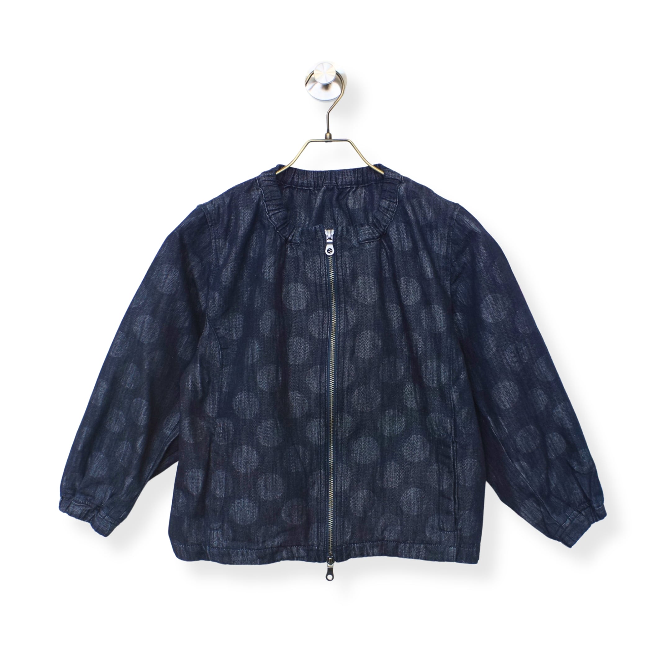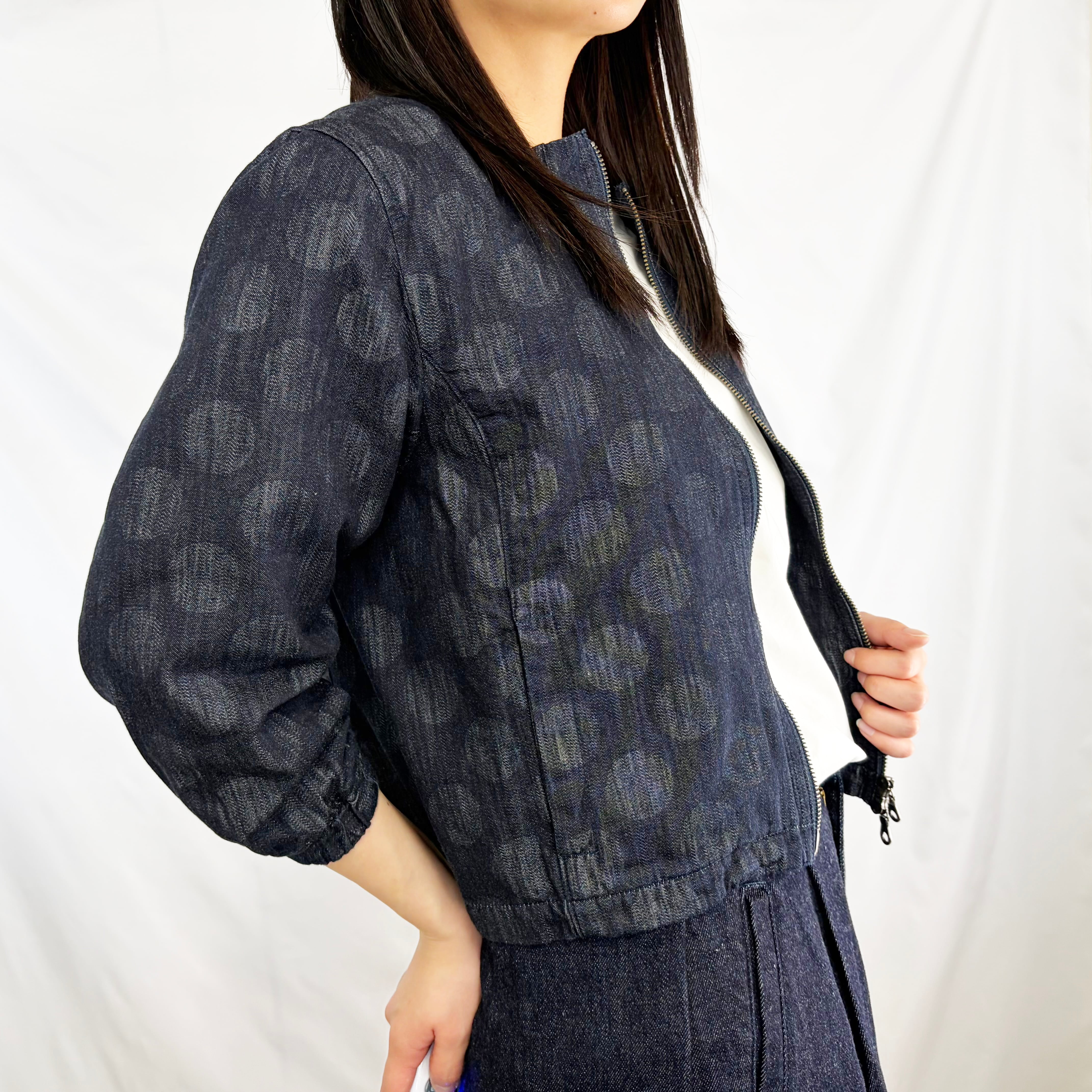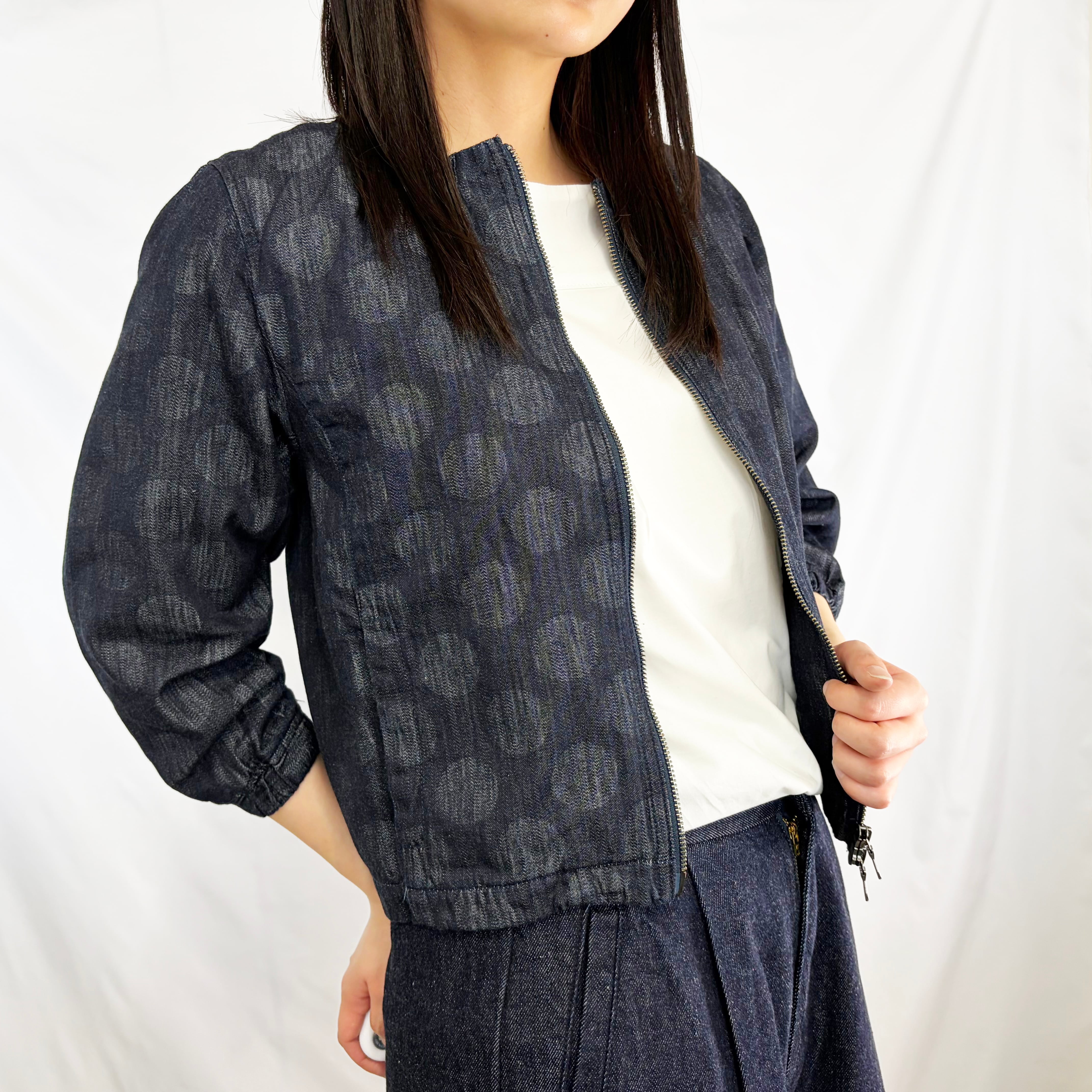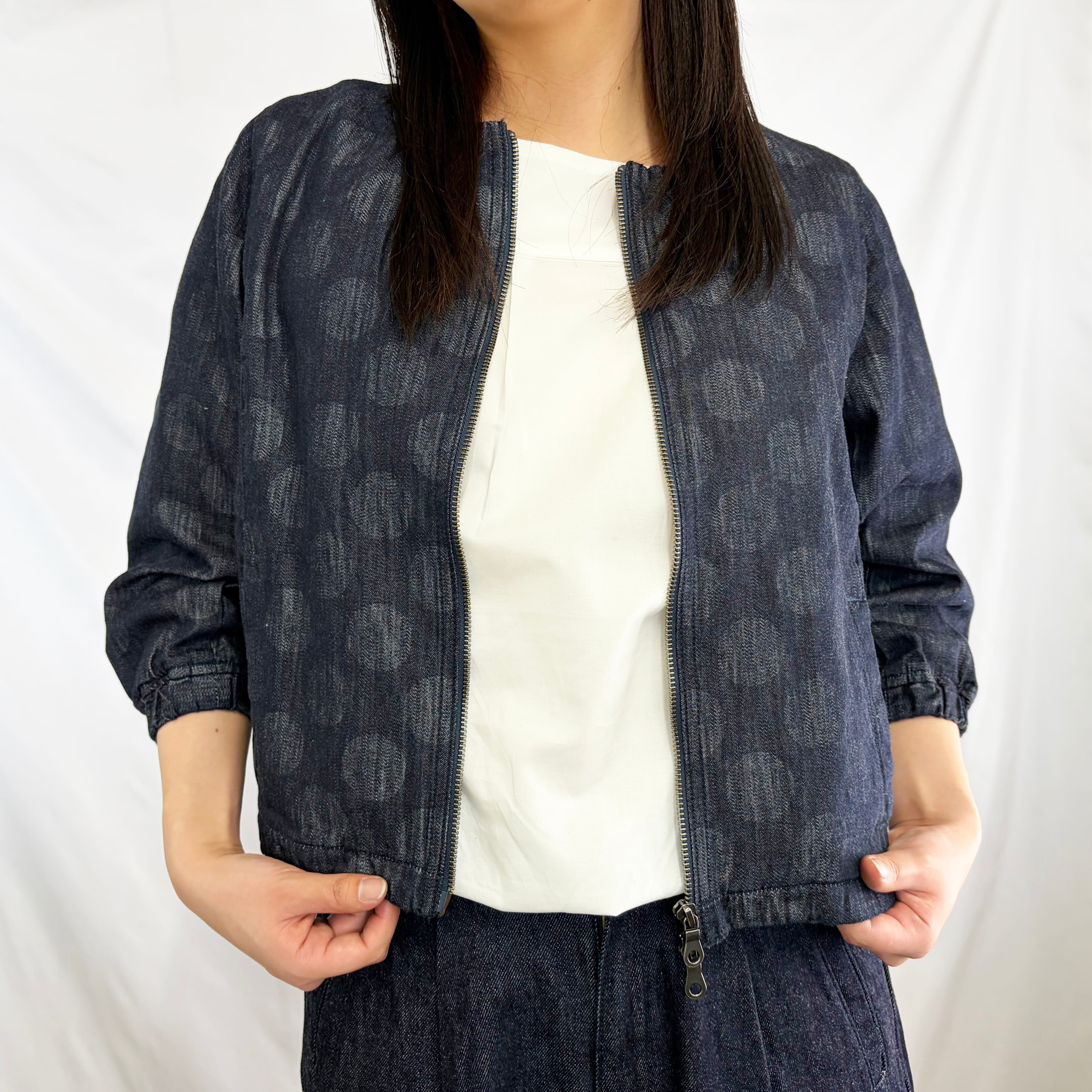 デニム調の落ち着いた色合いに、さりげない柄が浮かび上がり、シンプルながらも奥行きのある一着です。