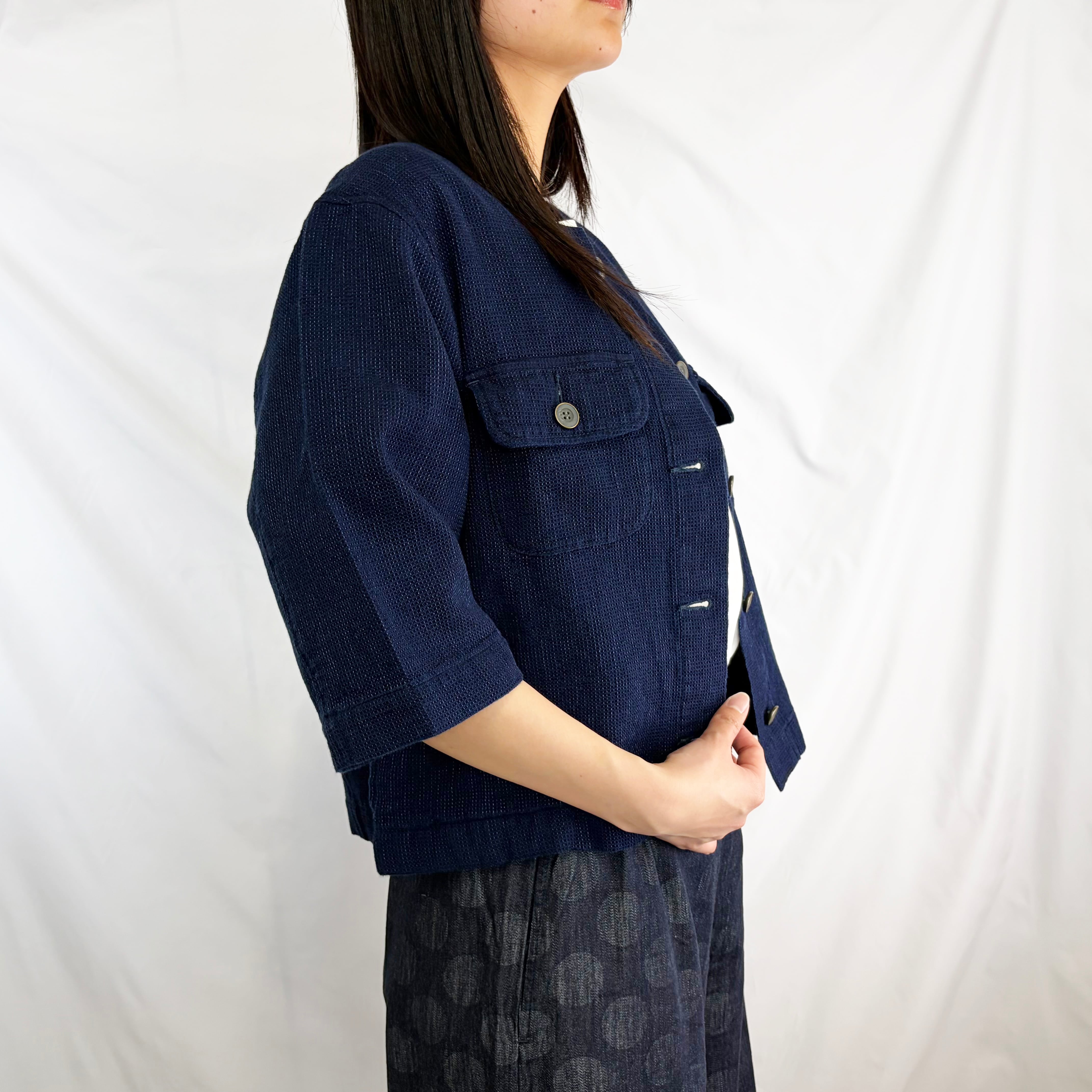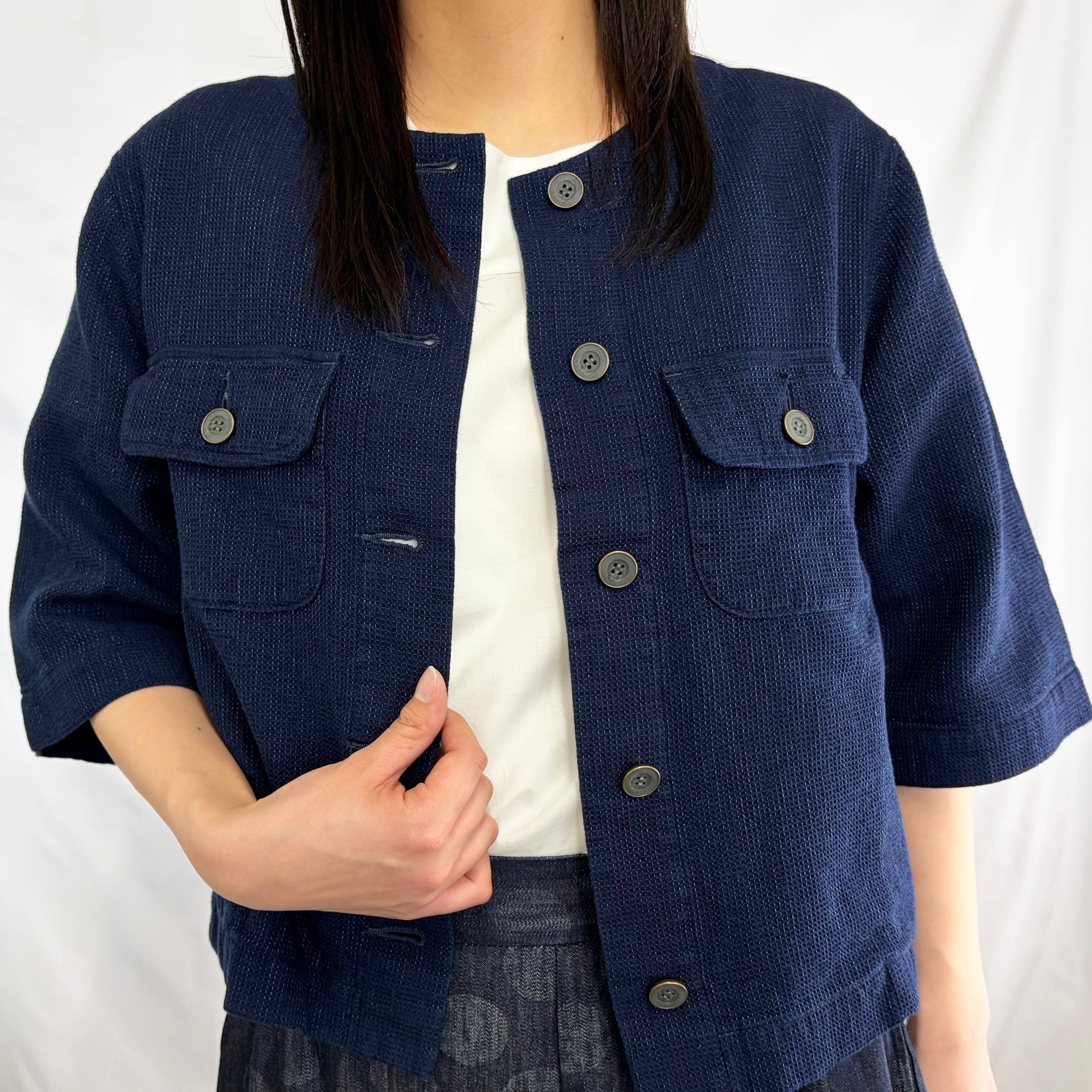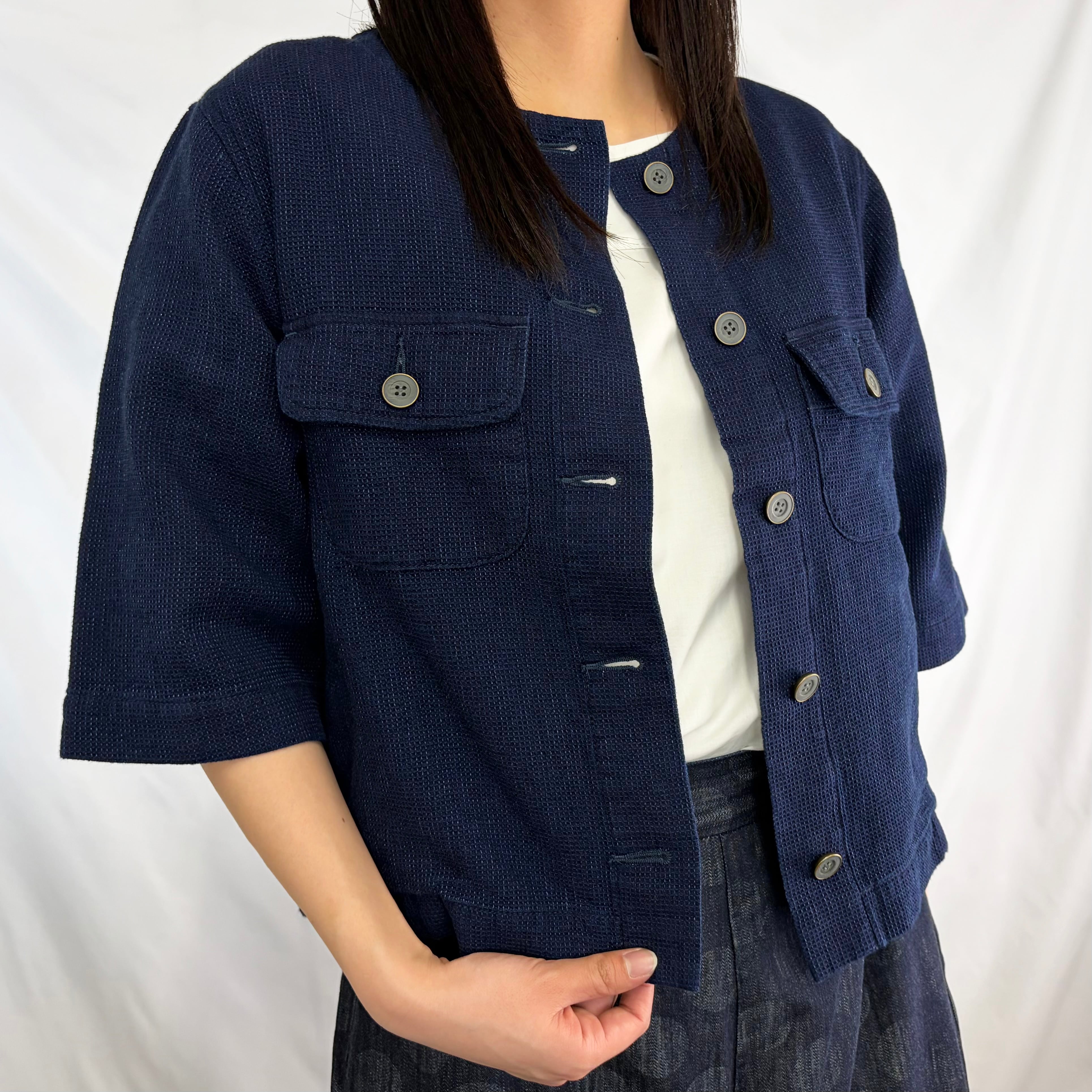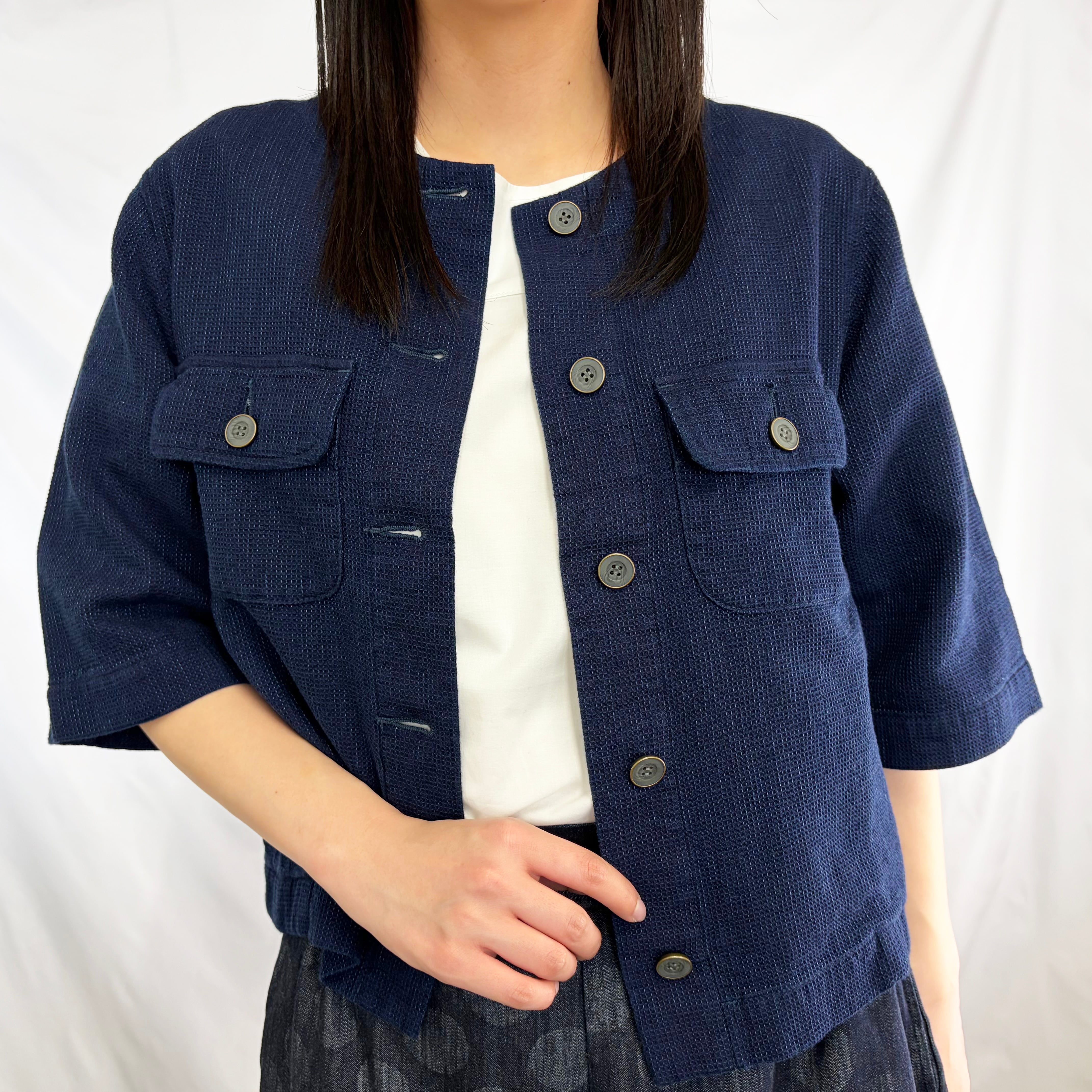 凹凸感のあるワッフル生地が特徴の、半袖ノーカラージャケット。