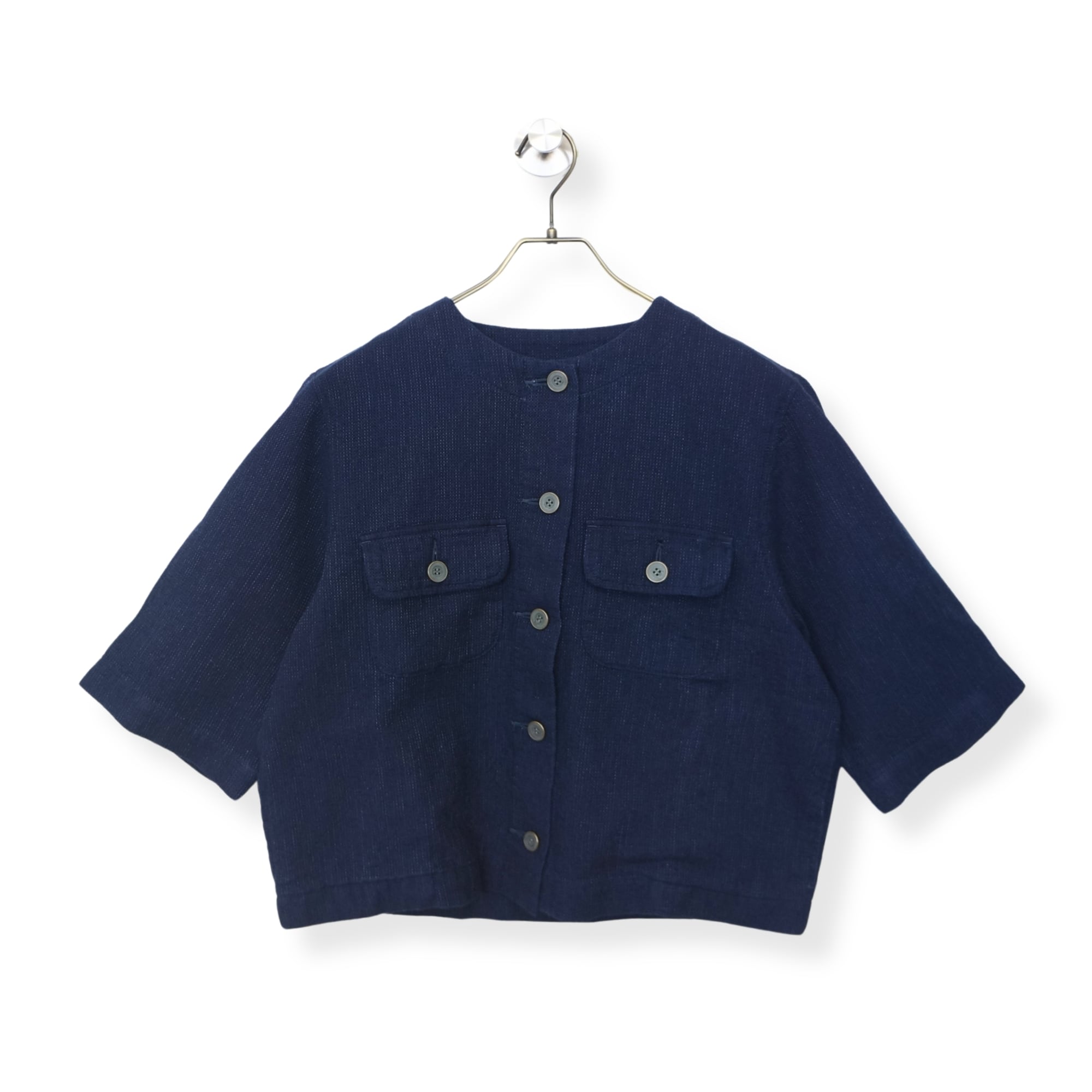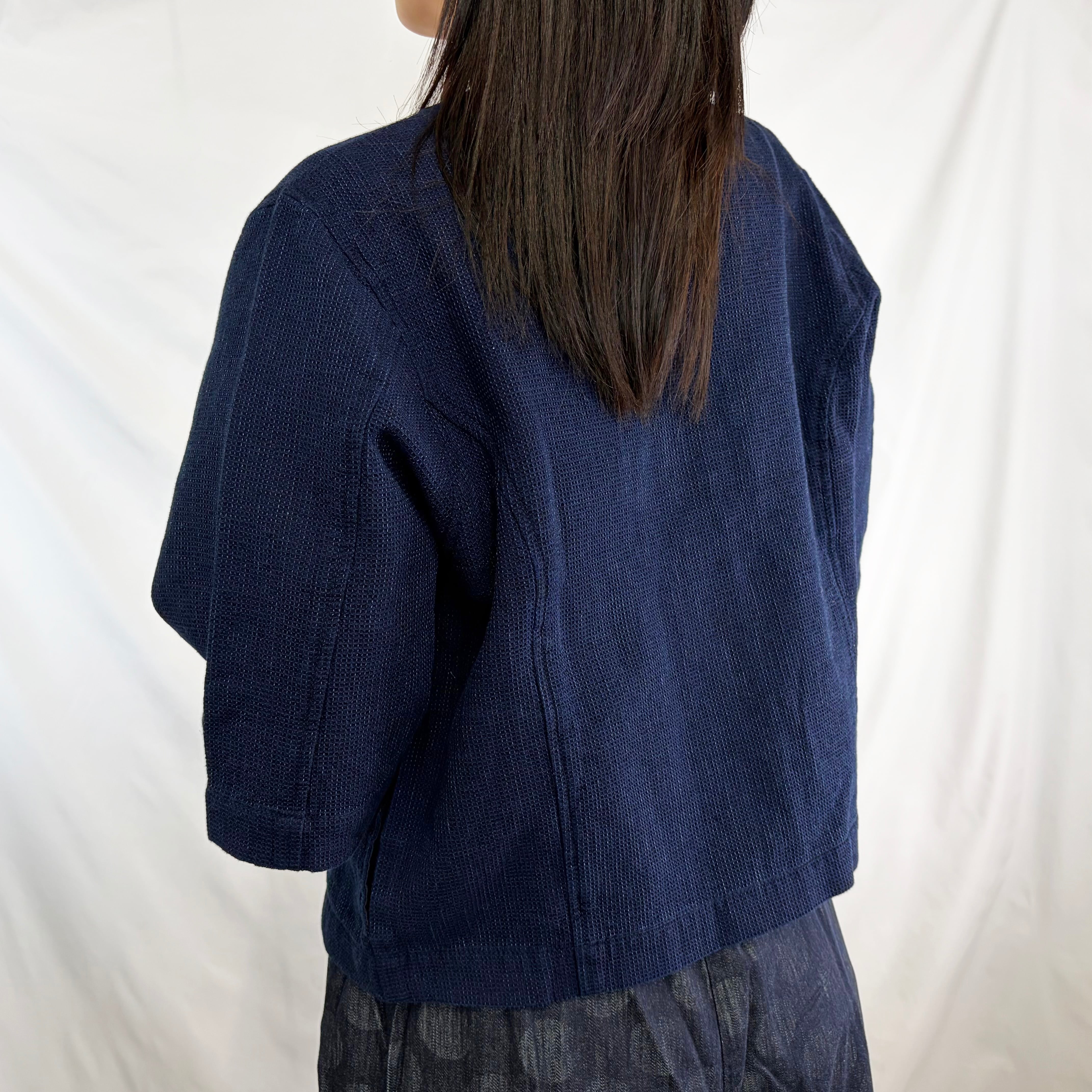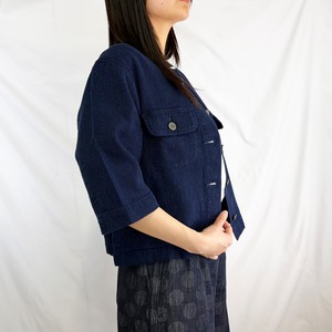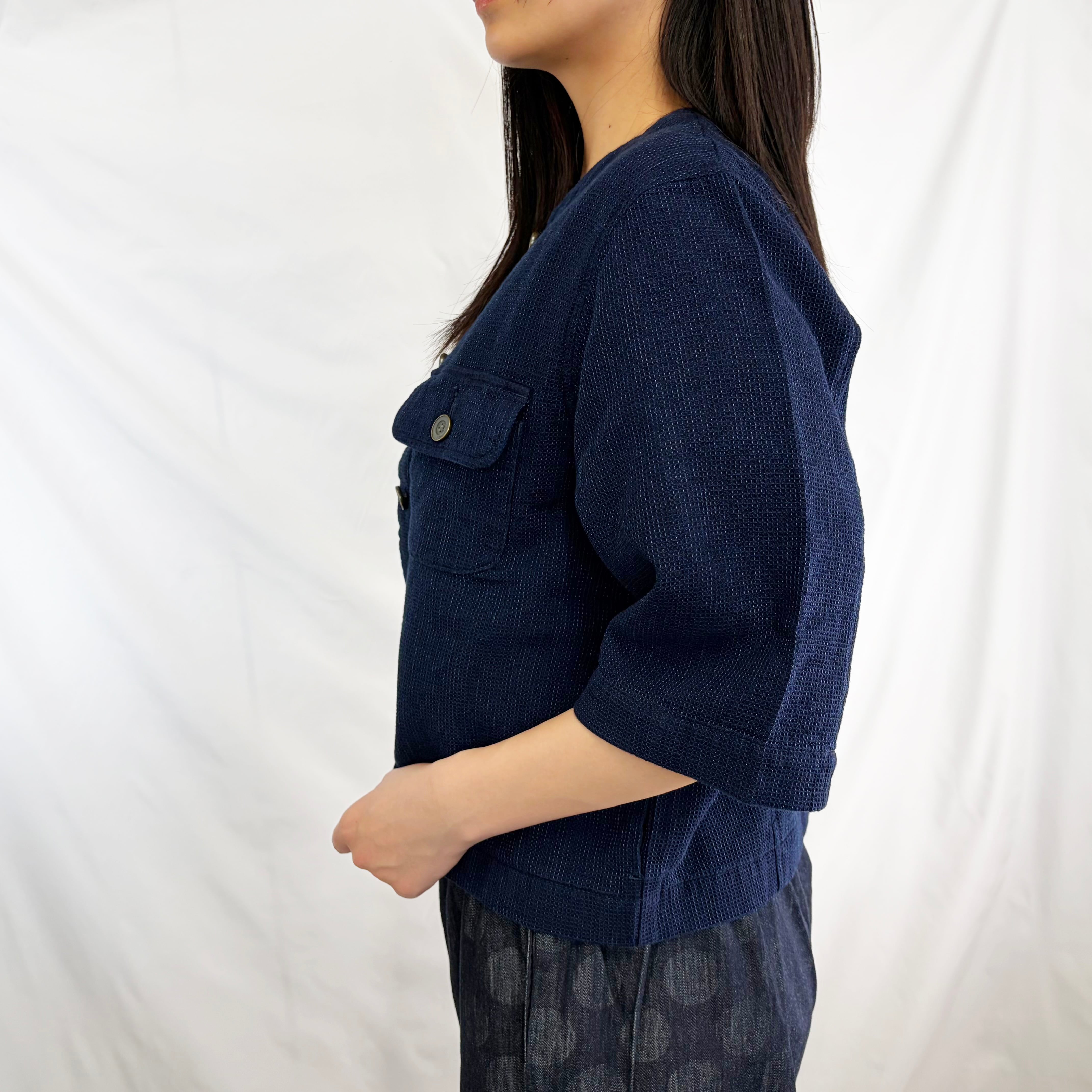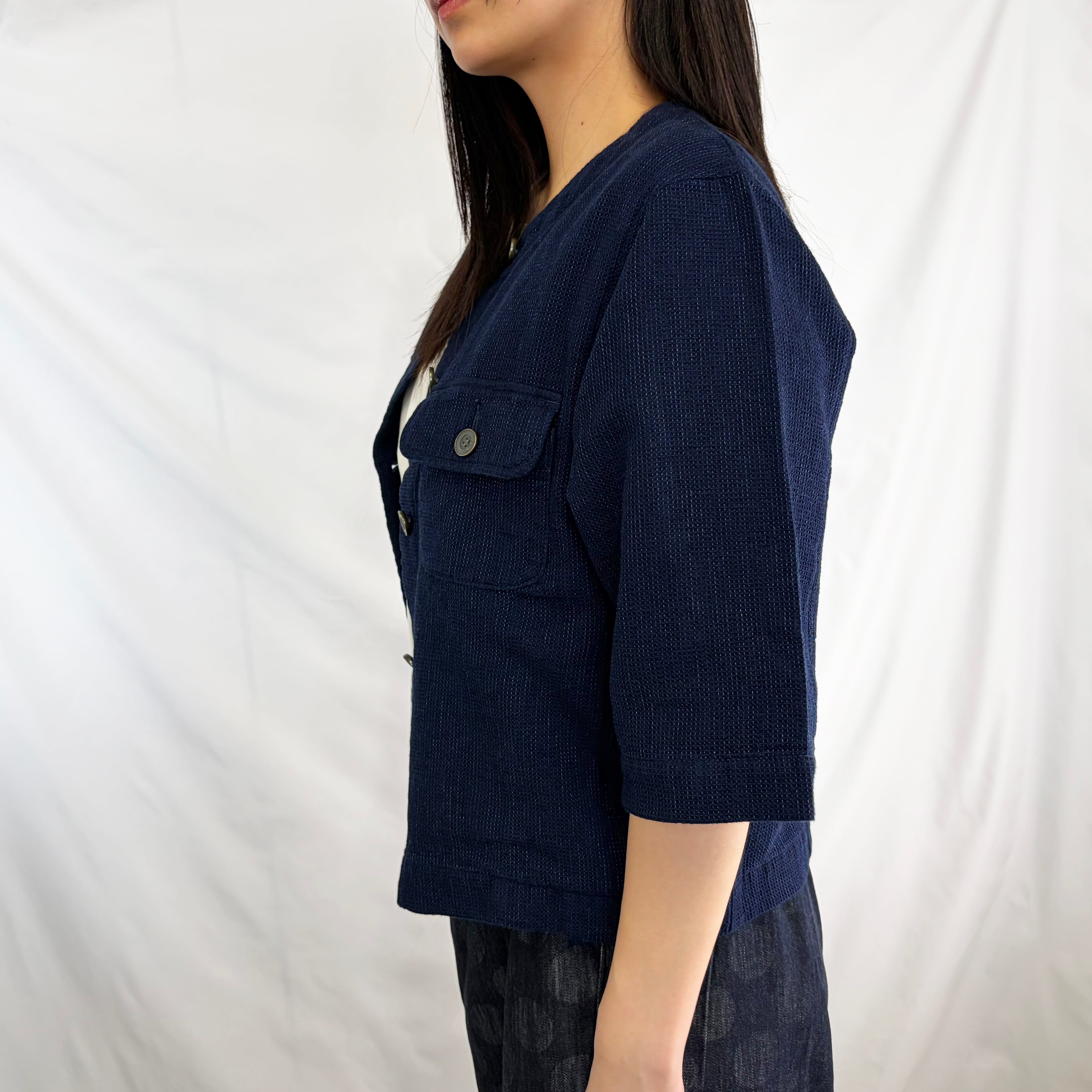凹凸感のあるワッフル生地が特徴の、半袖ノーカラージャケット。