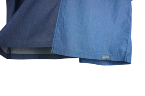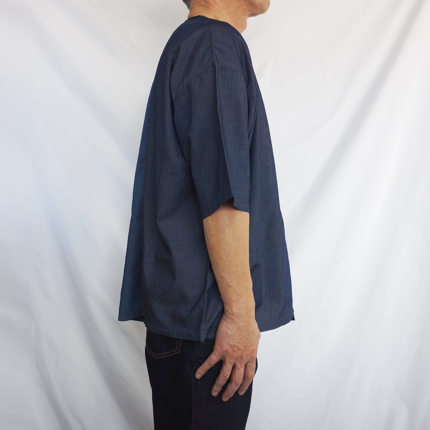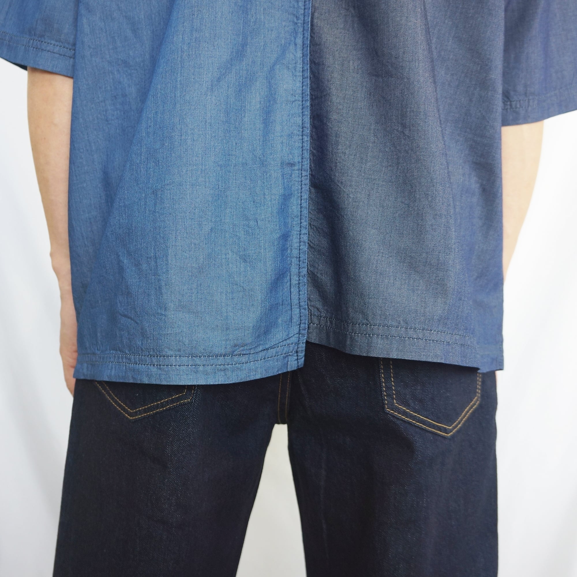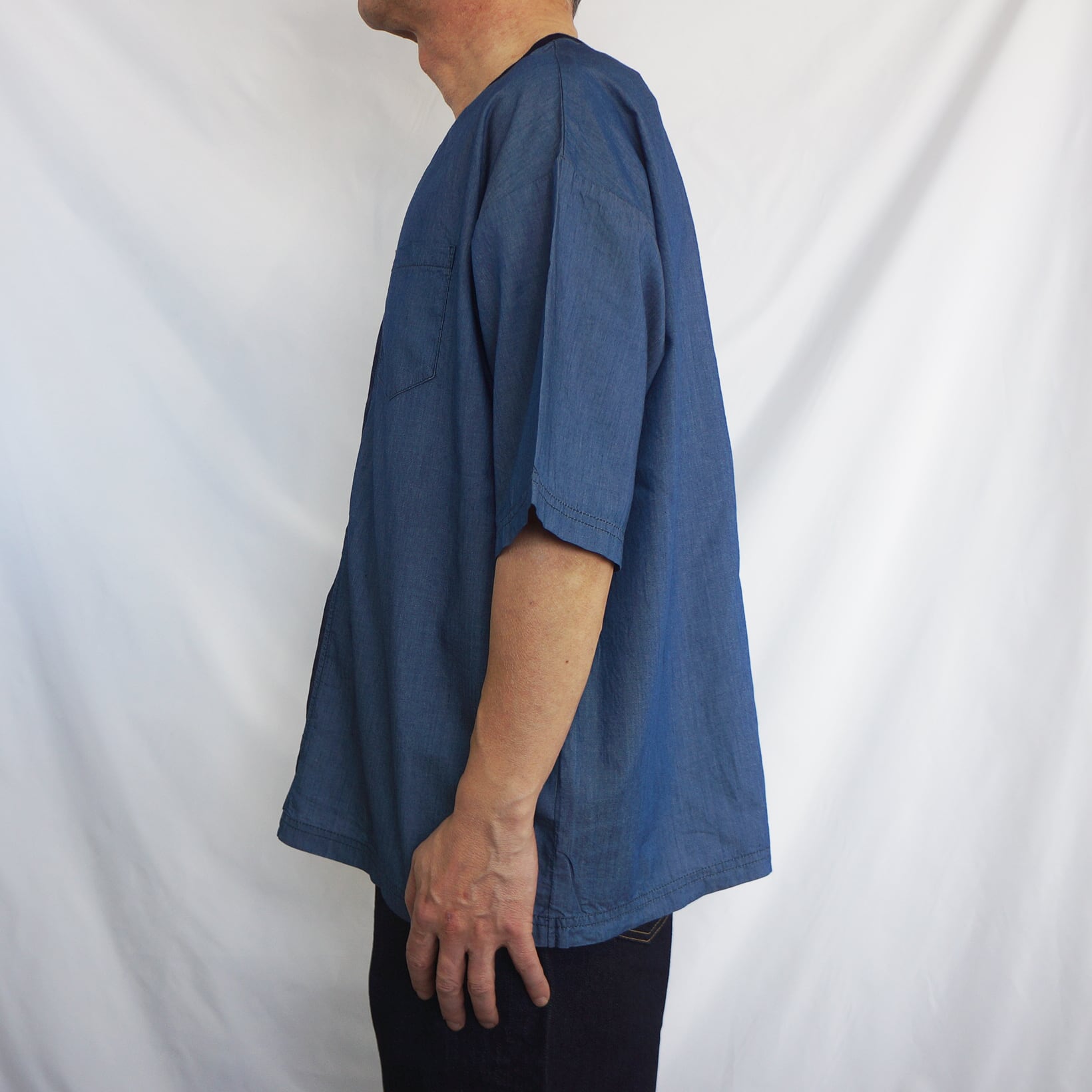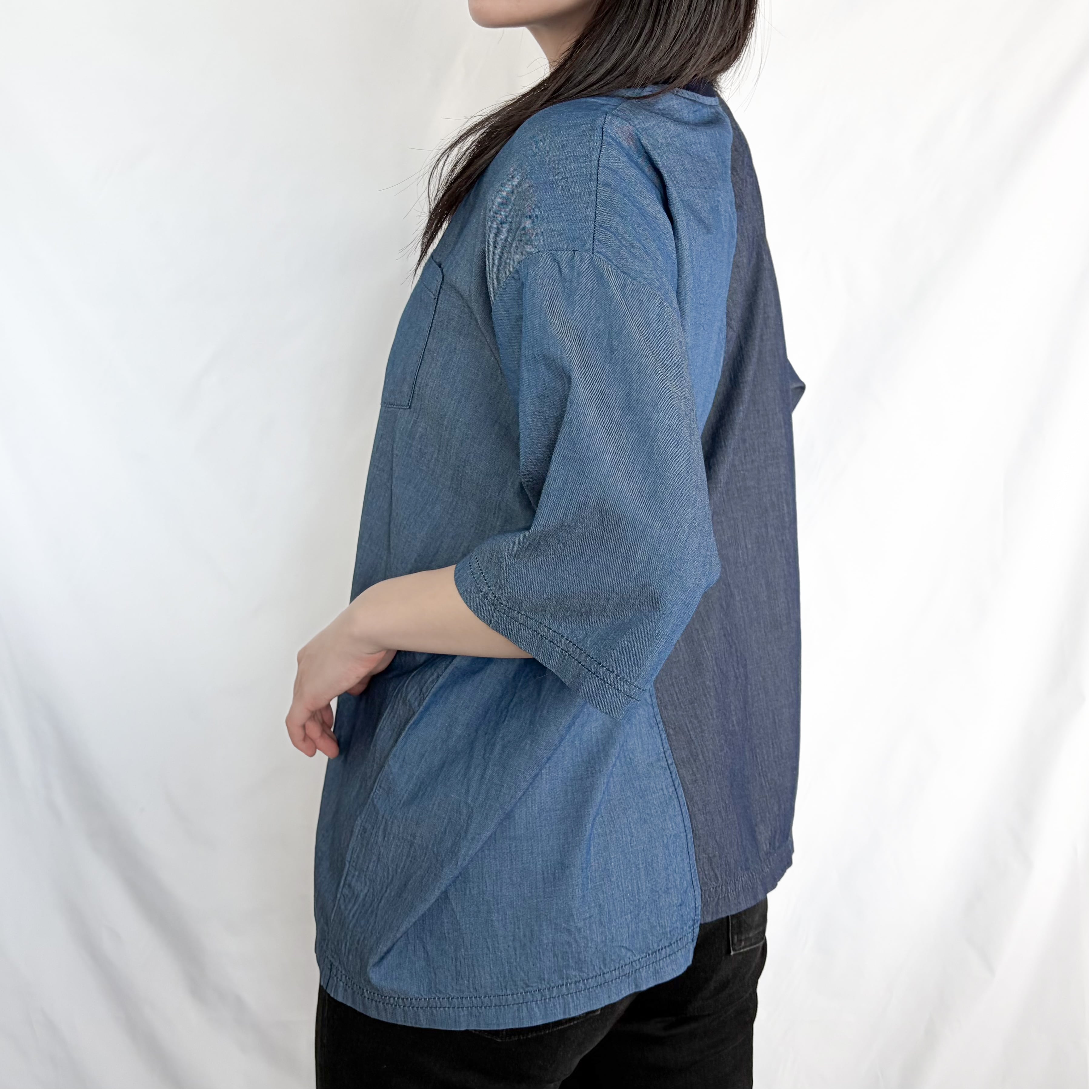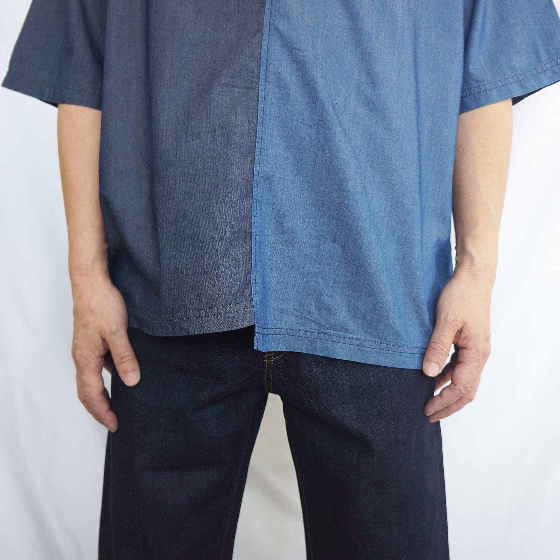 左右で色味の異なる生地を使用することで、シンプルながらも個性的な一枚に仕上げました。胸ポケットがさりげないアクセントになっています。