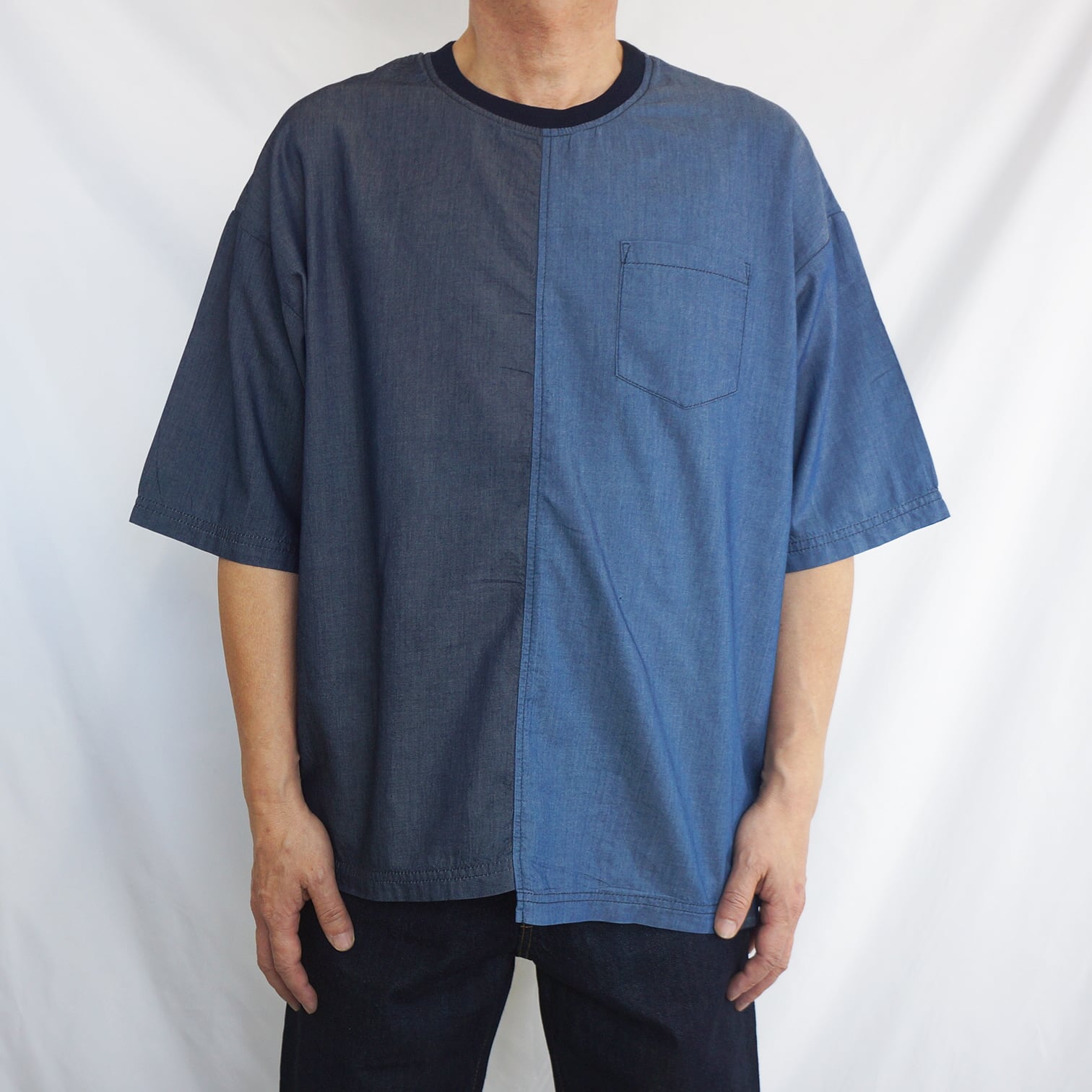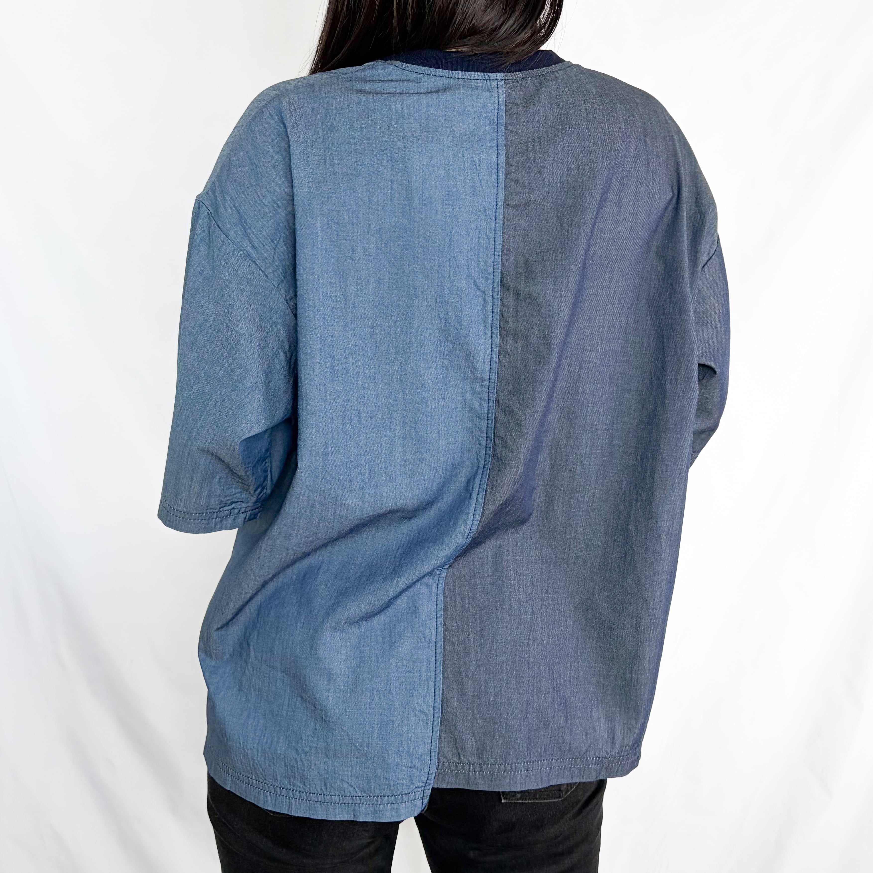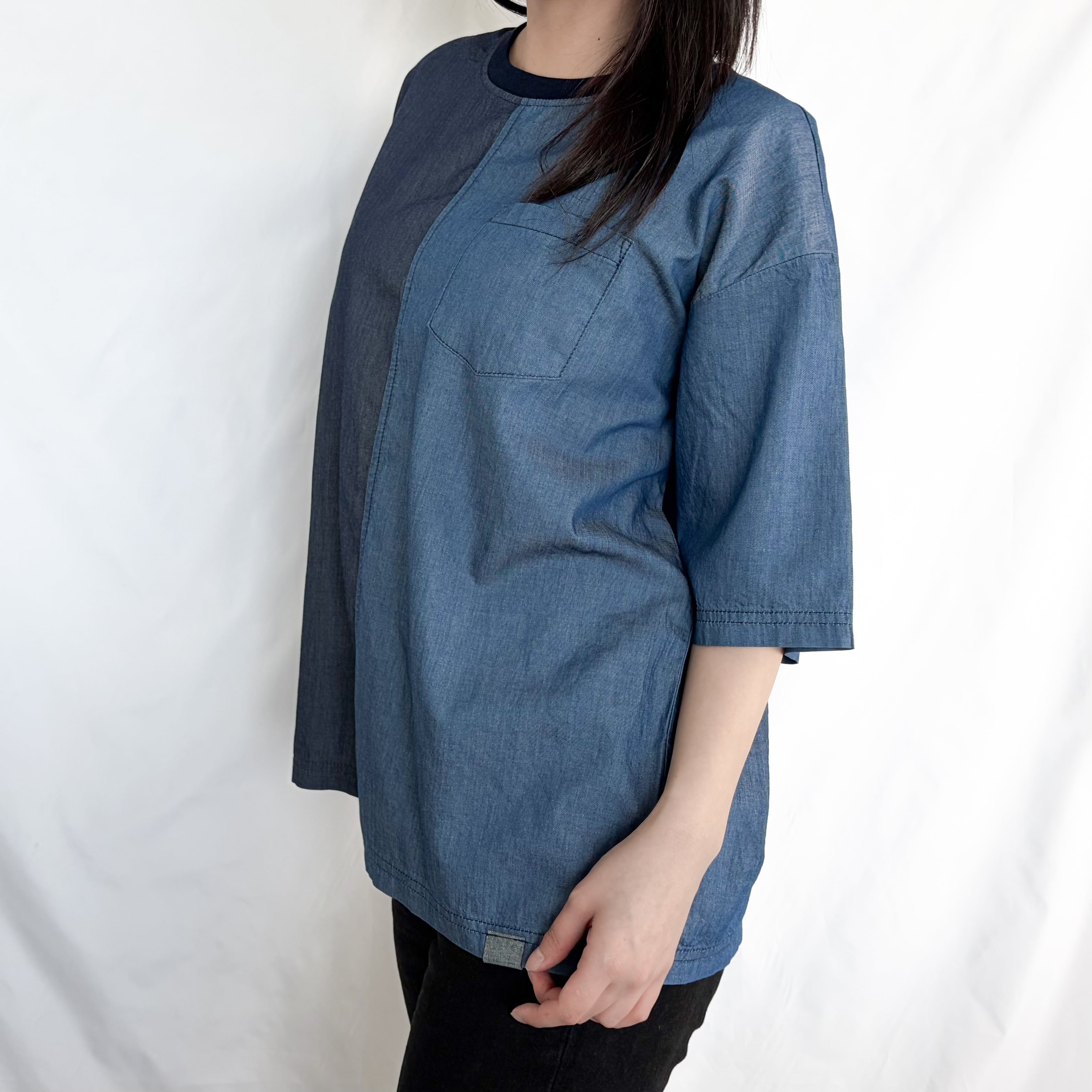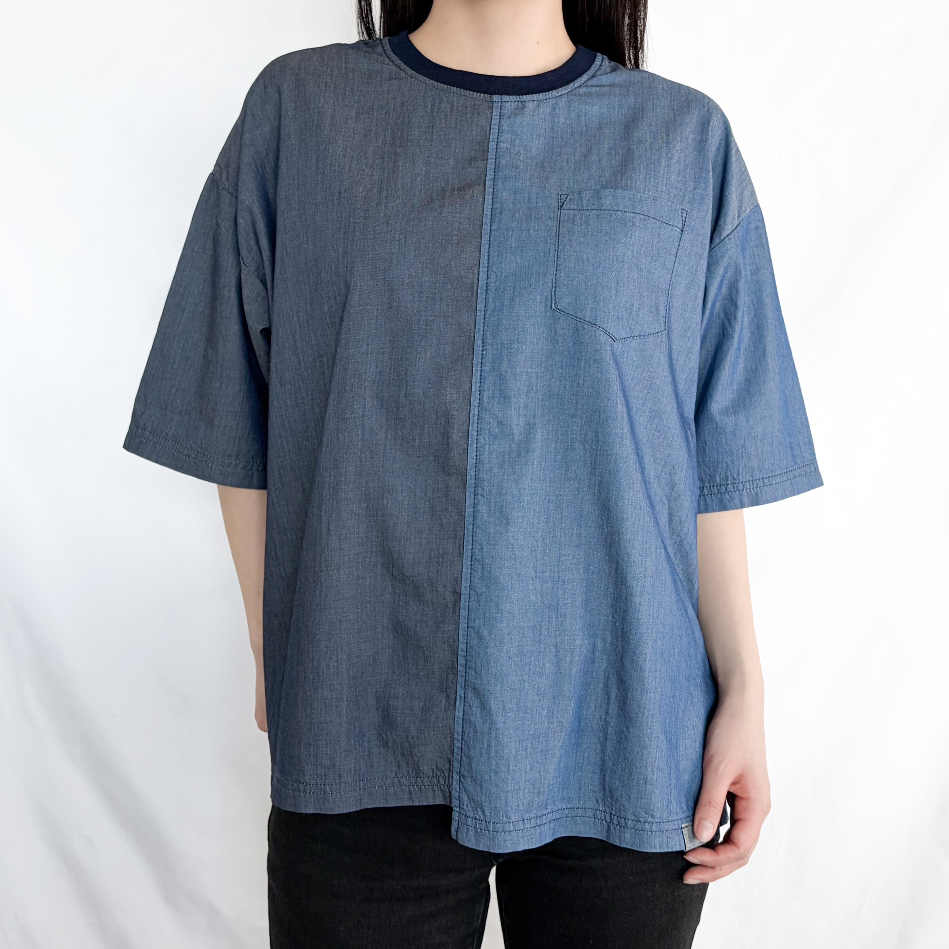 異なるデニム調の生地を組み合わせた、切り替えデザインのTシャツ。