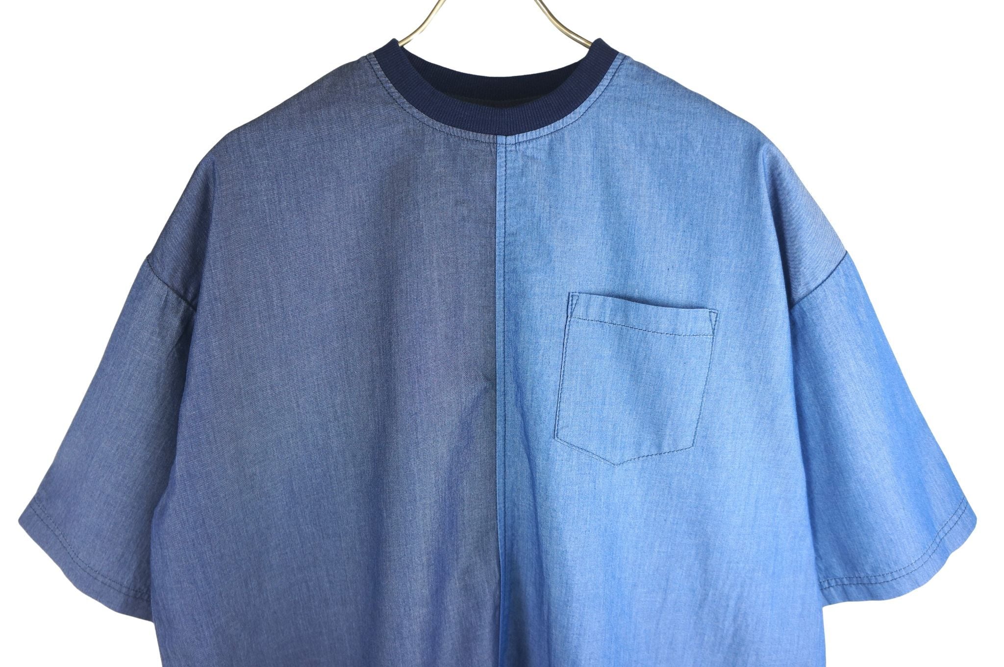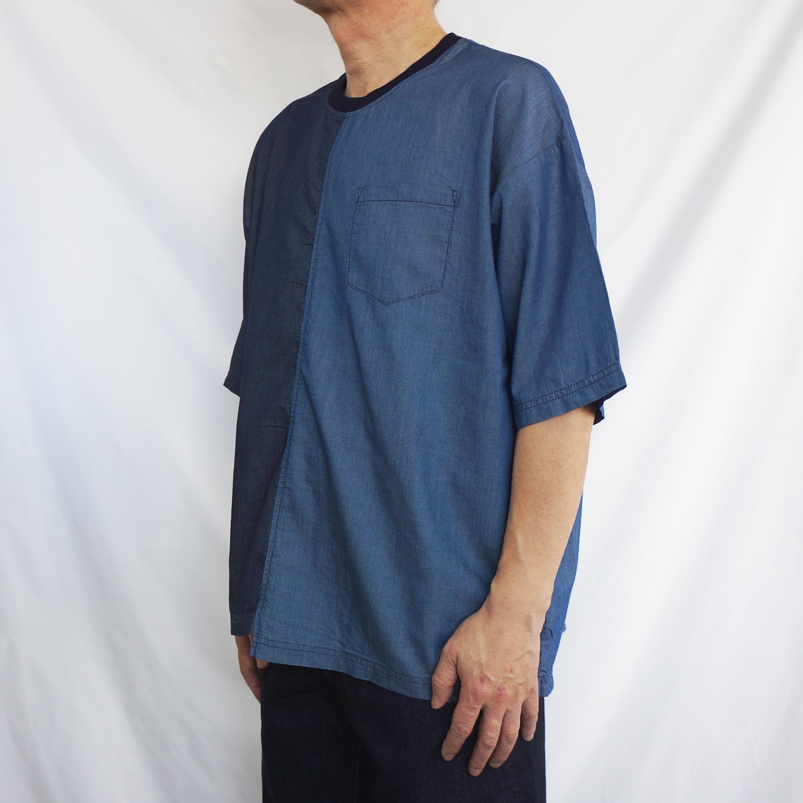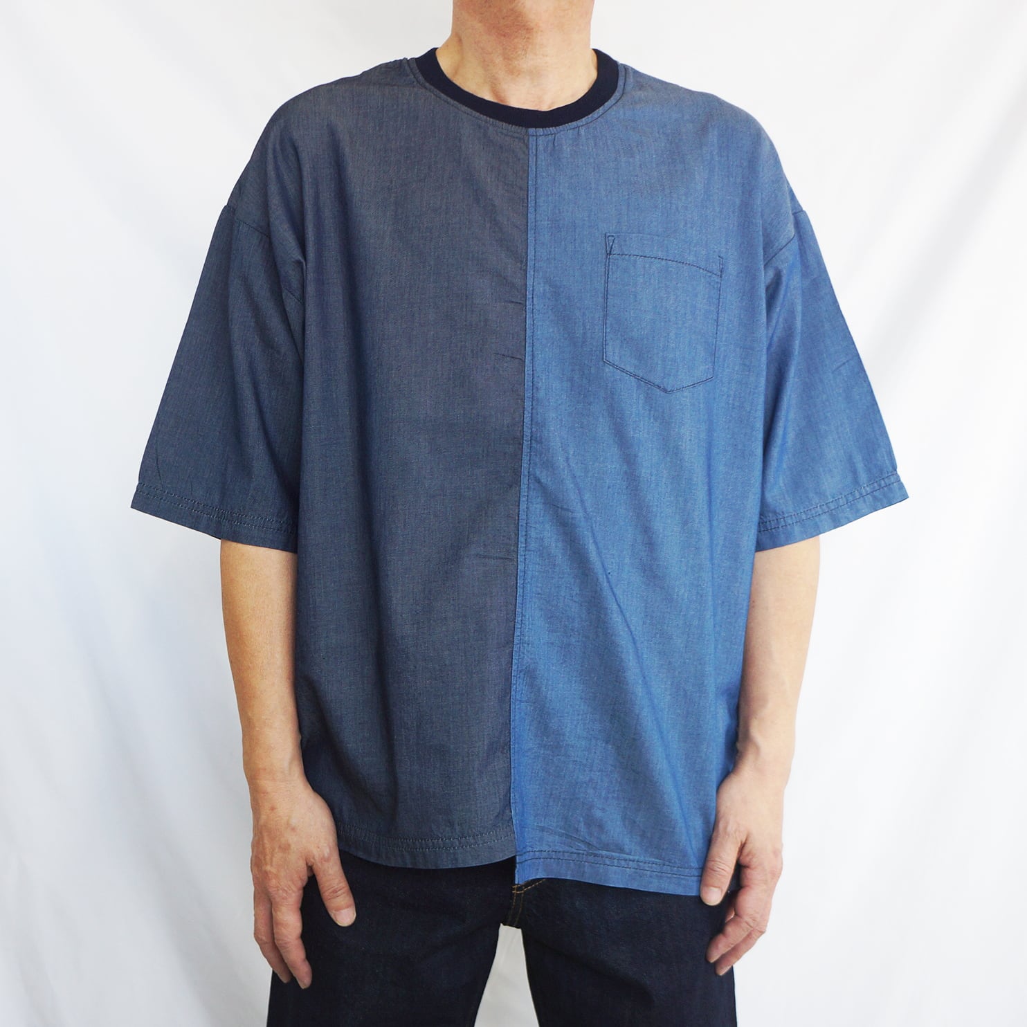 異なるデニム調の生地を組み合わせた、切り替えデザインのTシャツ。