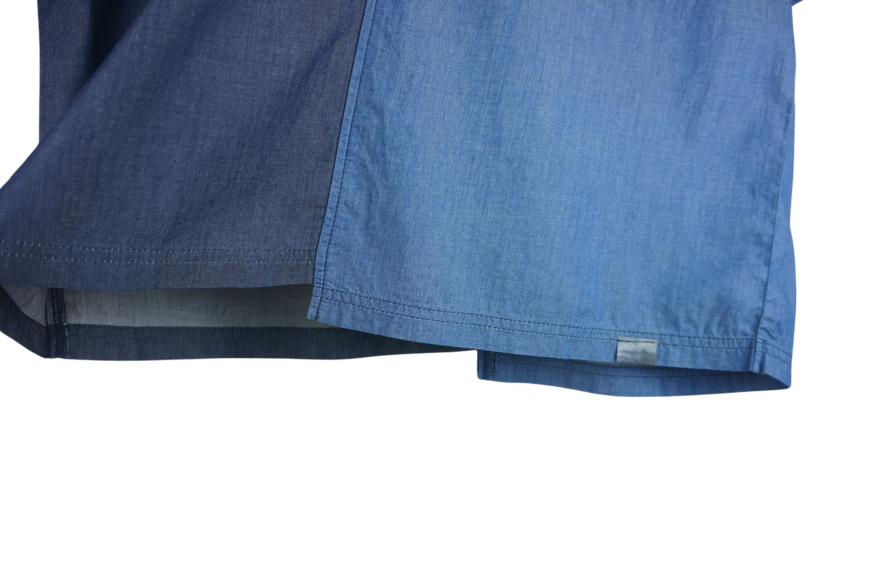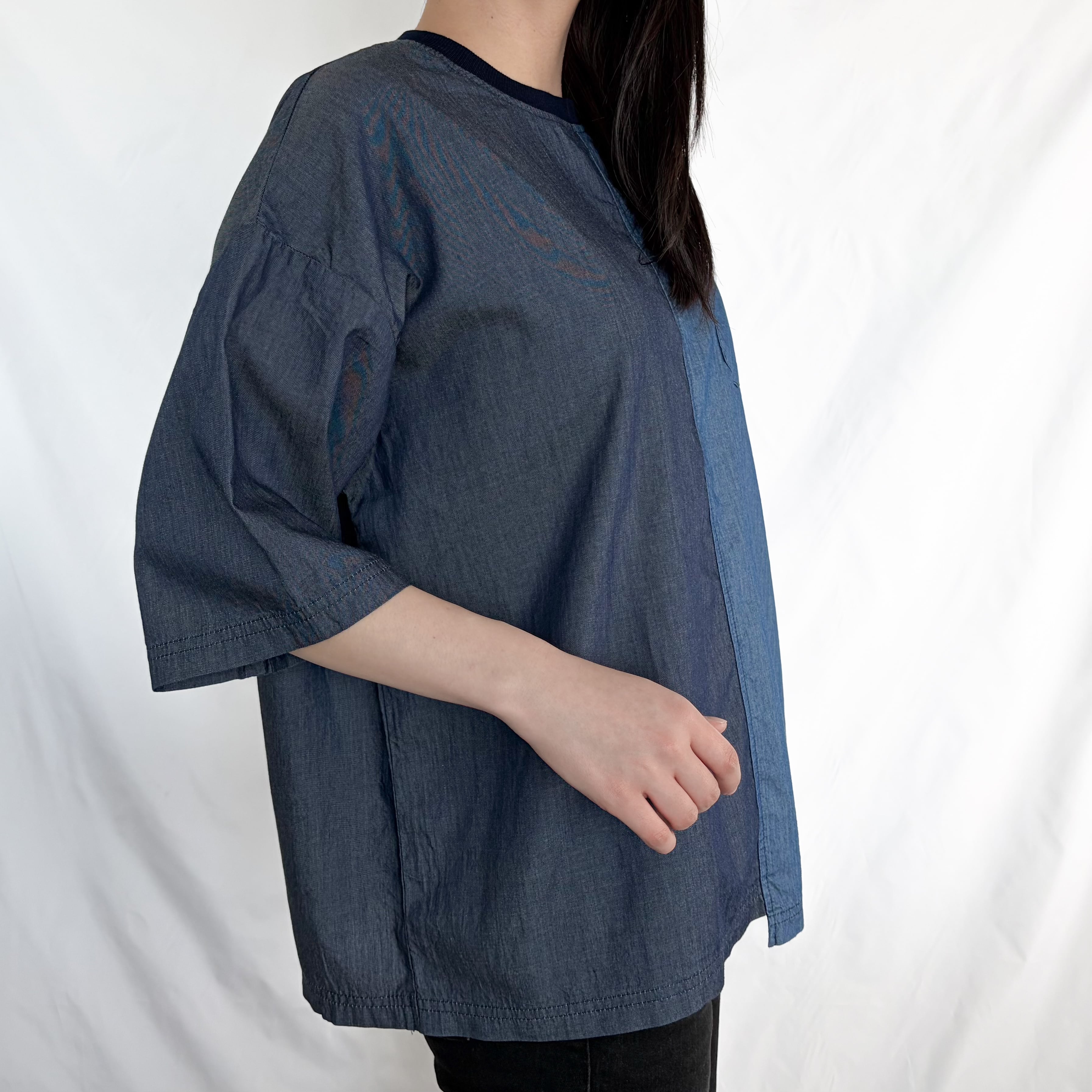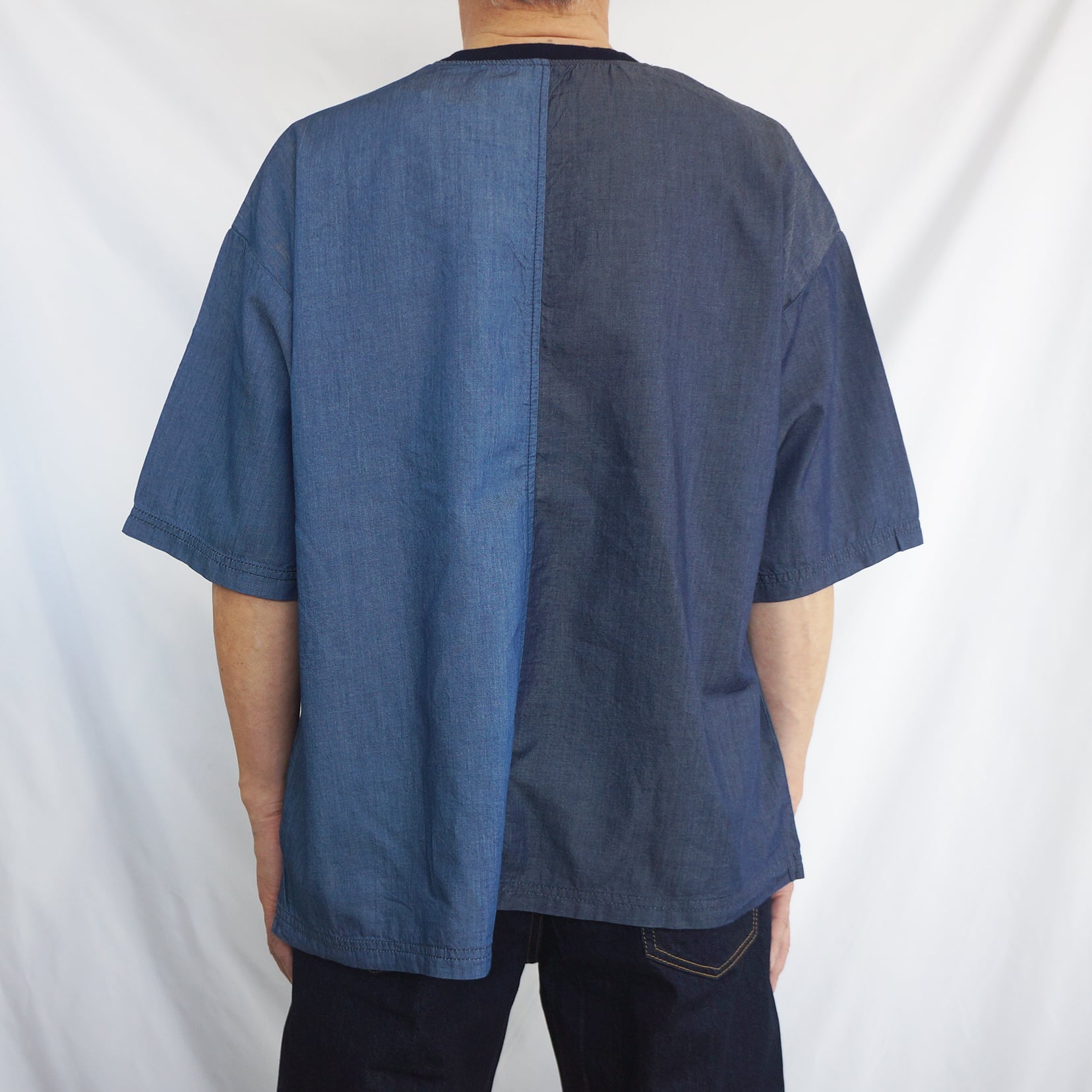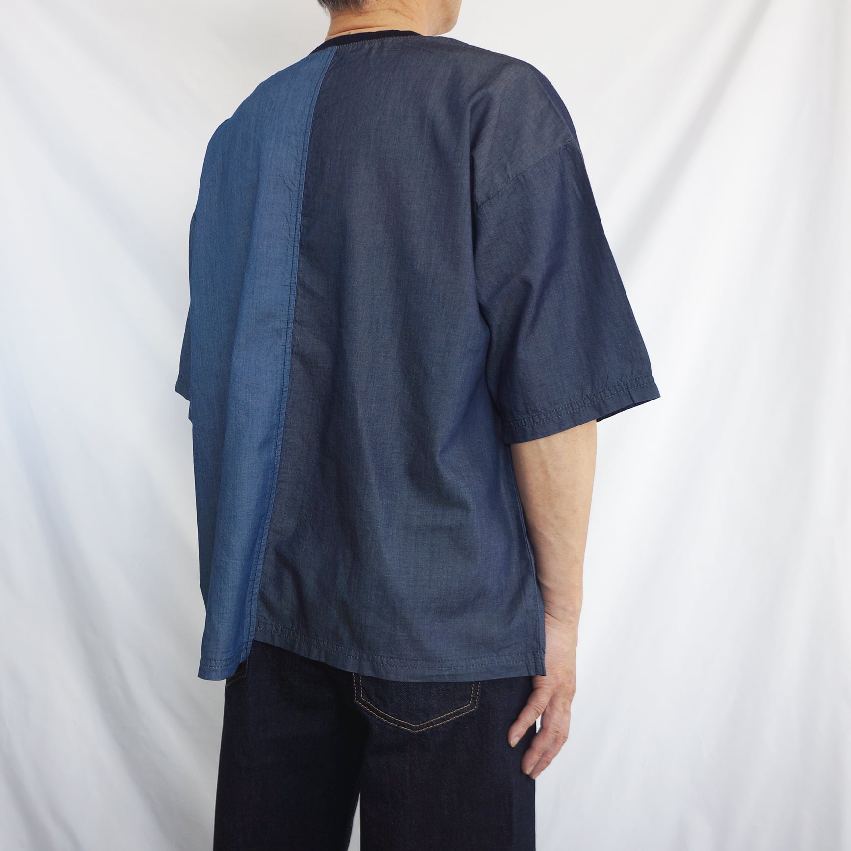 異なるデニム調の生地を組み合わせた、切り替えデザインのTシャツ。