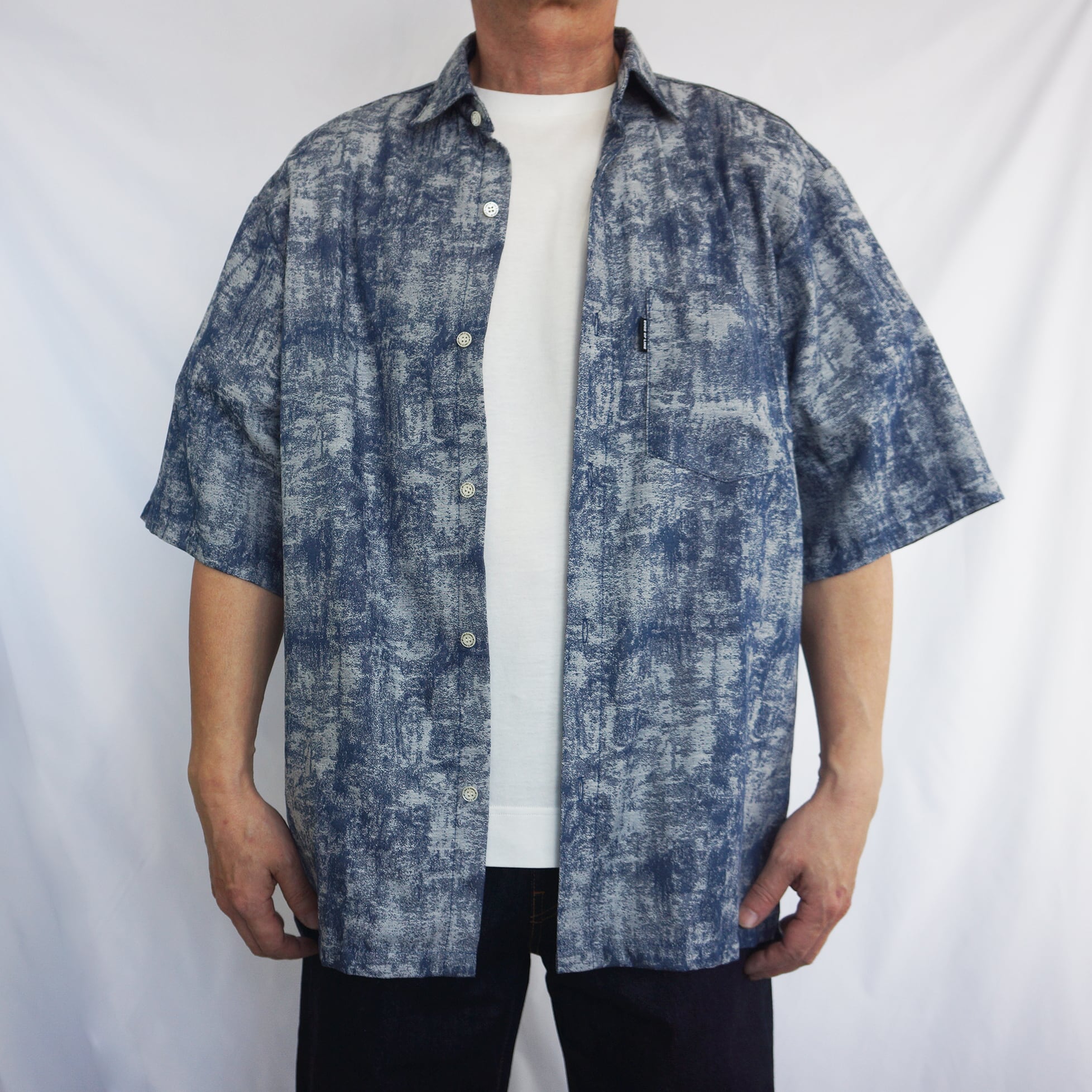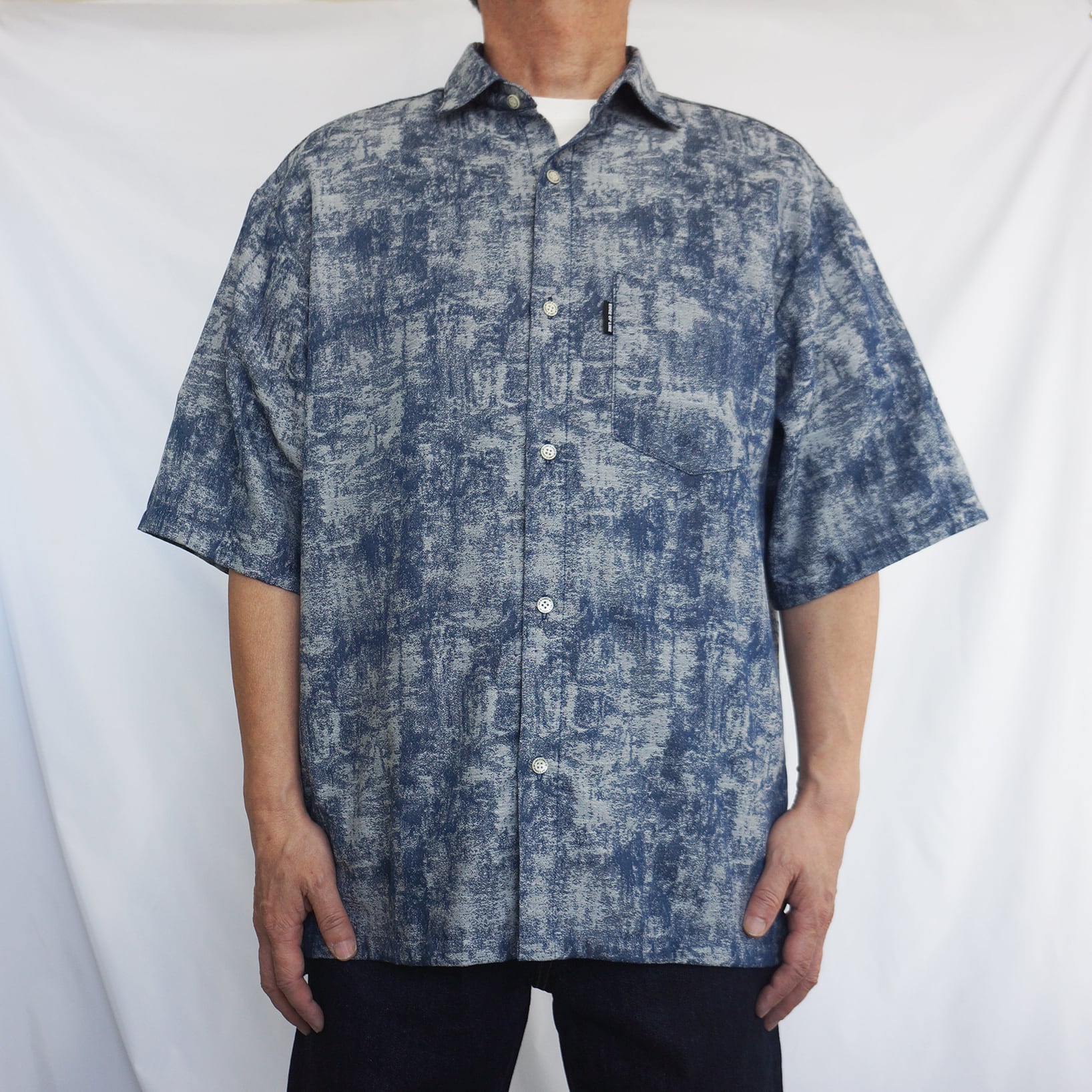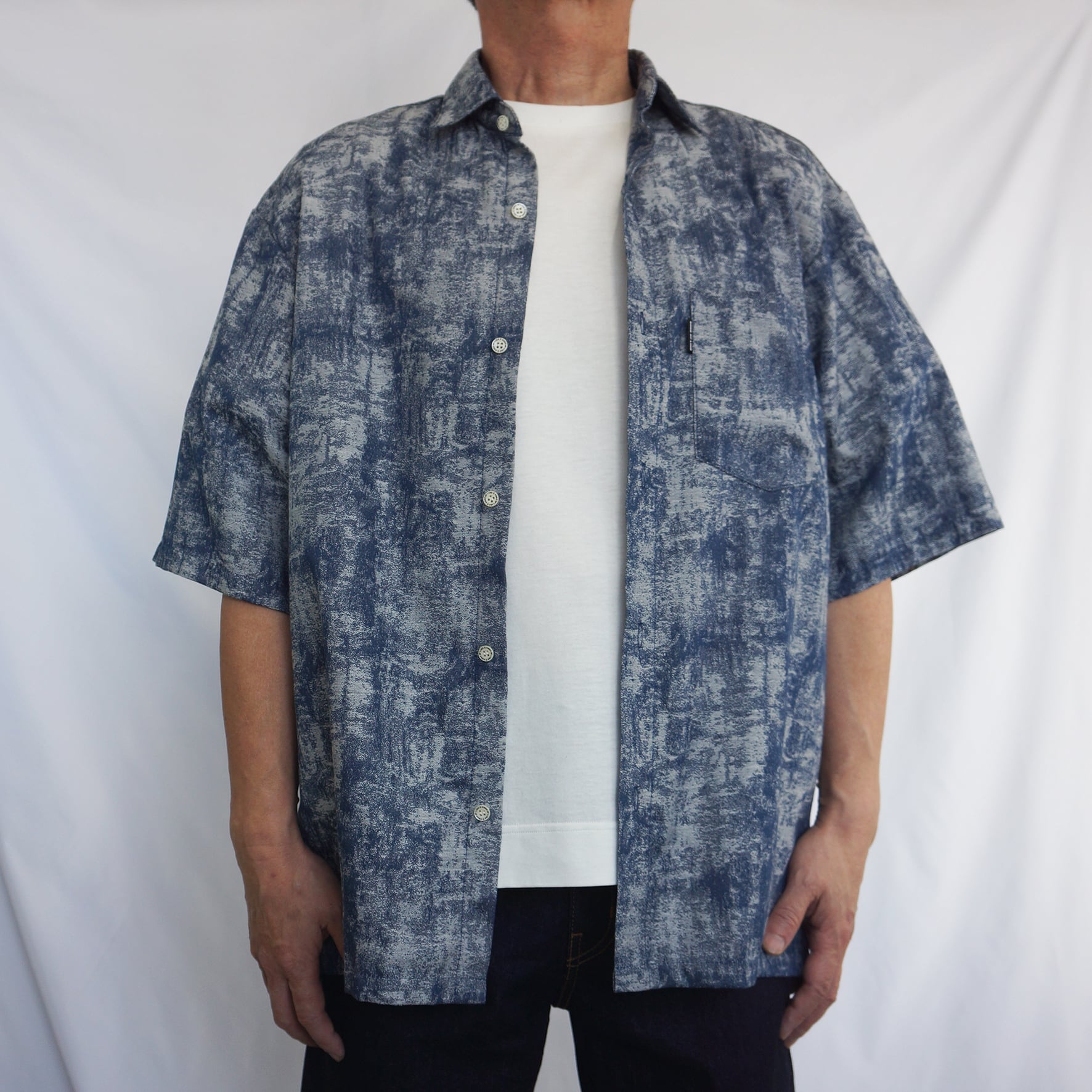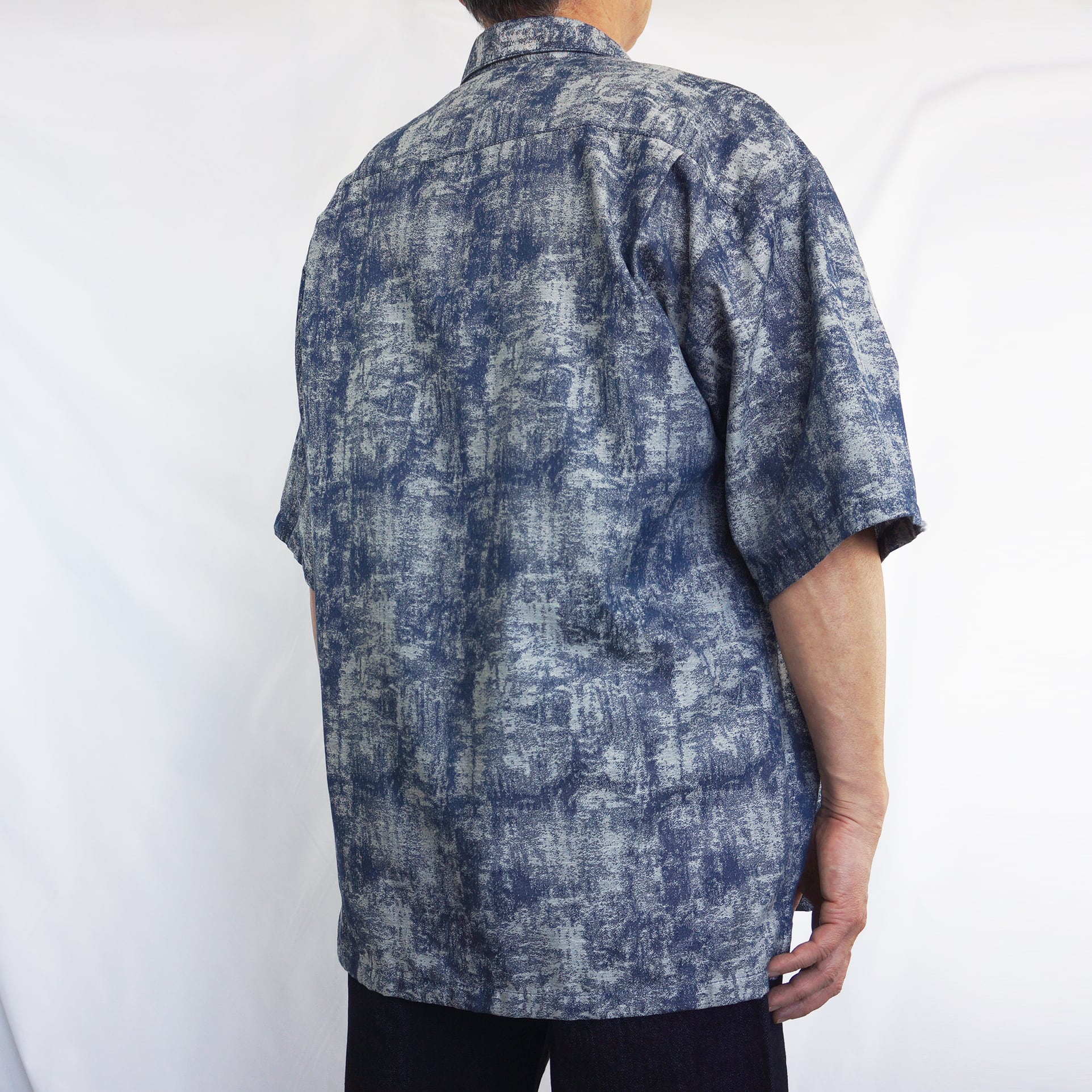 独特のかすれた風合いの柄が印象的な、ネイビーカラーの半袖シャツ。