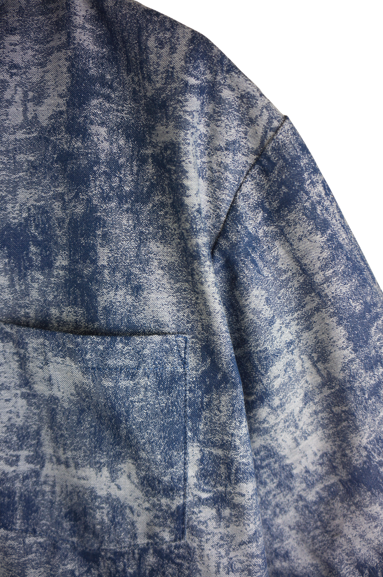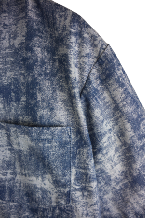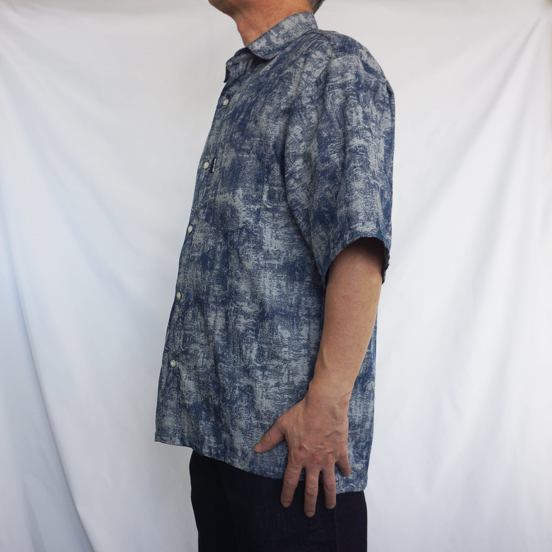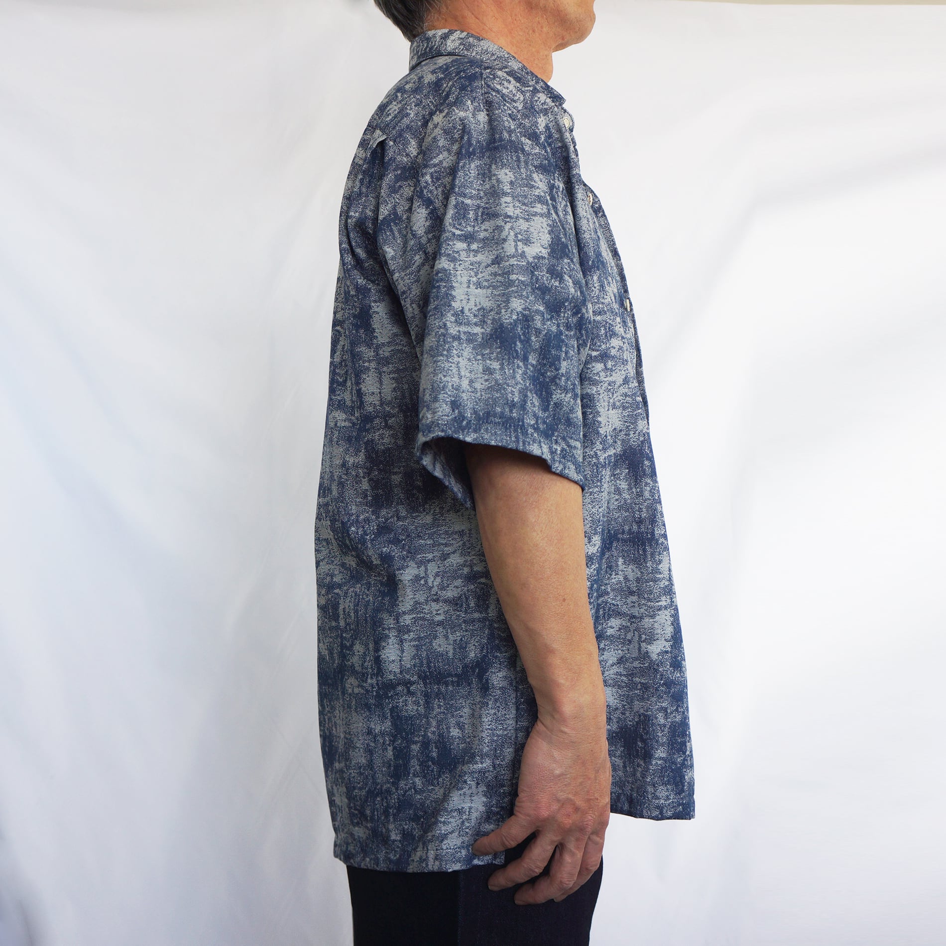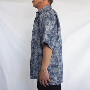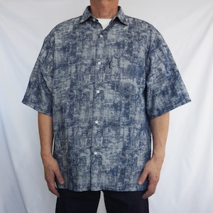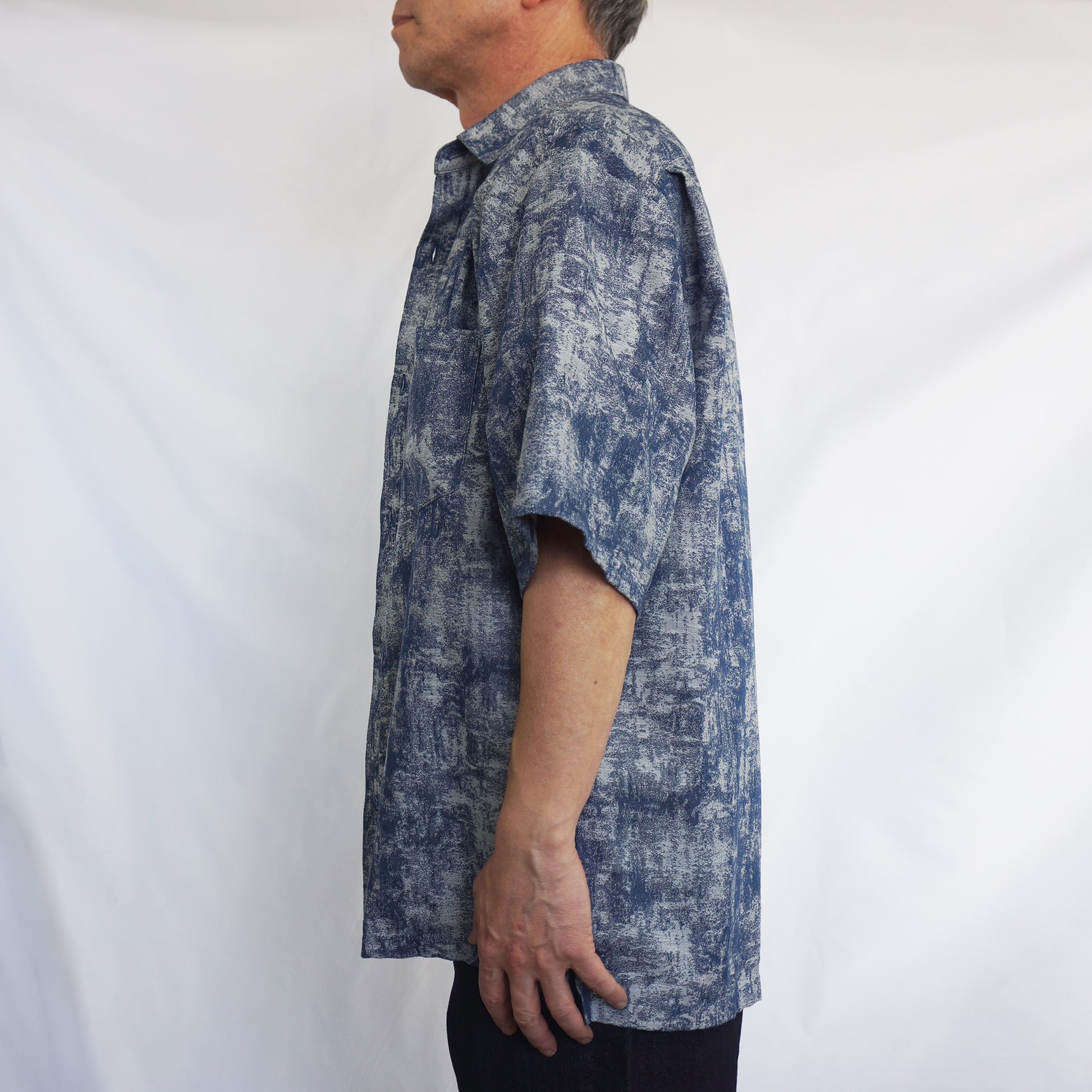 独特のかすれた風合いの柄が印象的な、ネイビーカラーの半袖シャツ。